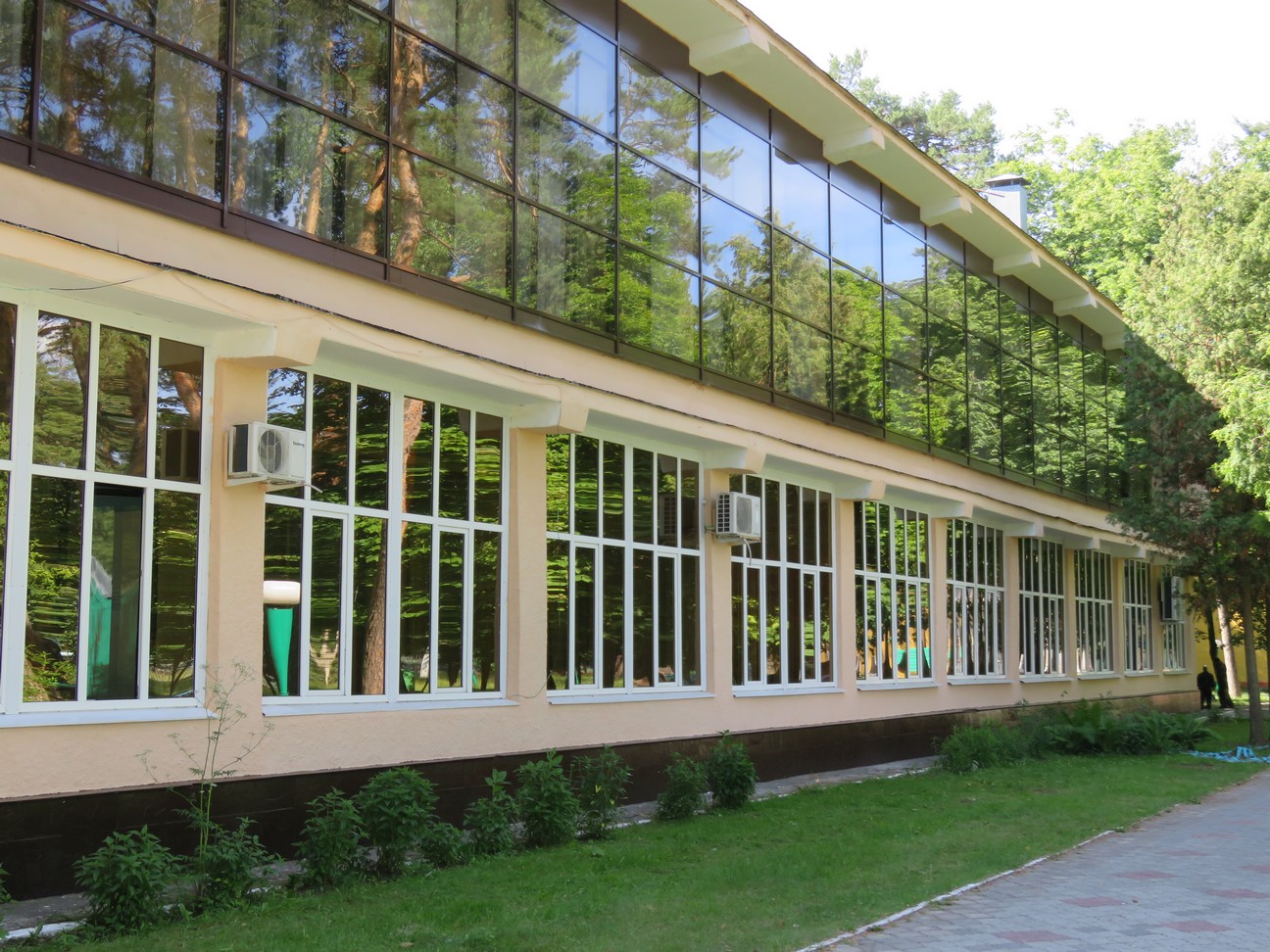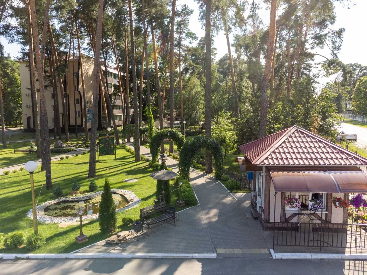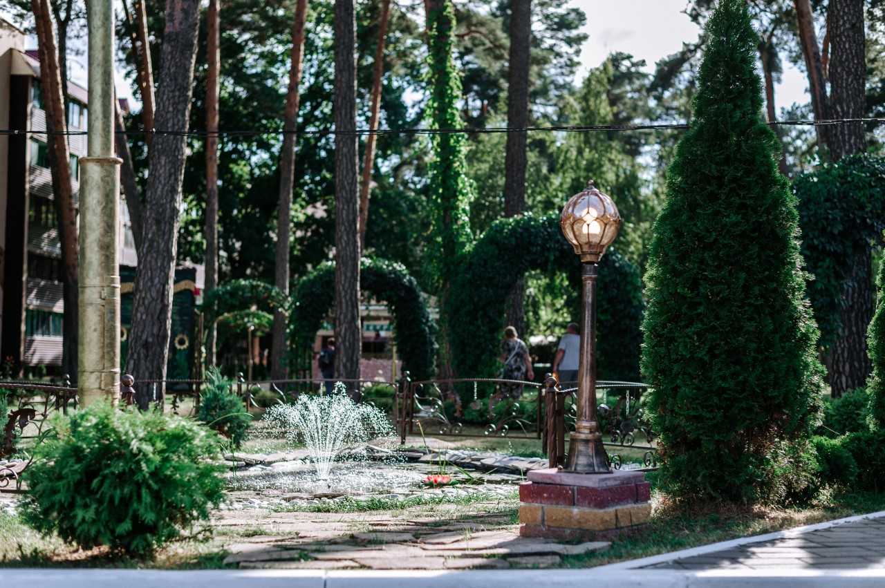 Спальные корпуса, водогрязелечебница и др. сооружения находятся в оформлении красивейшего парка санатория с хвойными и лиственными деревьями, кустарниками.
