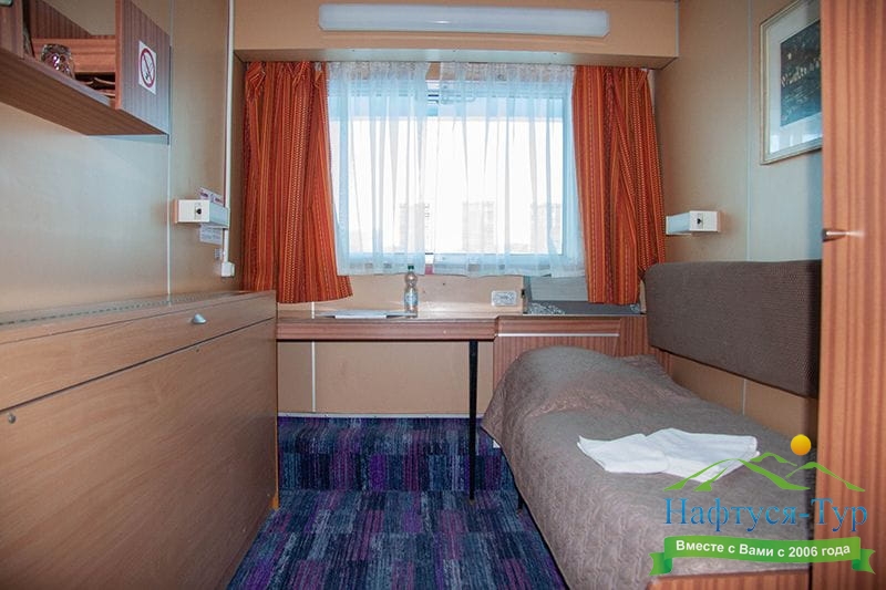 В каюте: одно спальное место, шкаф для одежды, радио, душ, санузел, кондиционер, обзорное окно, электророзетка 220V.