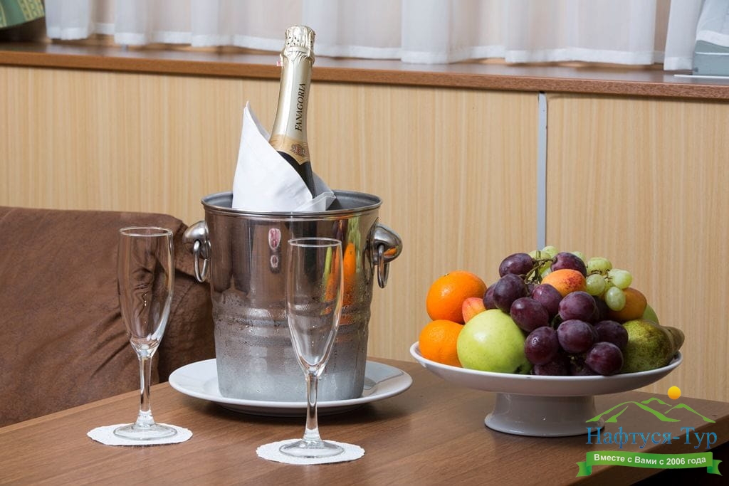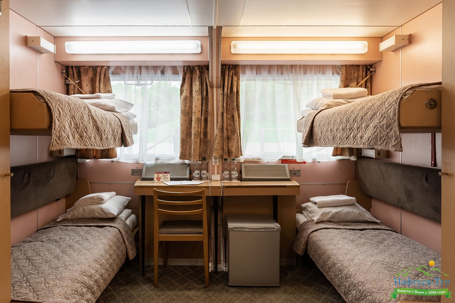 В каюте: четыре спальных места (два внизу, два вторым ярусом), шкаф для одежды, радио, душ, 2 санузла, холодильник, кондиционер, два обзорных окна, электророзетка 220V.