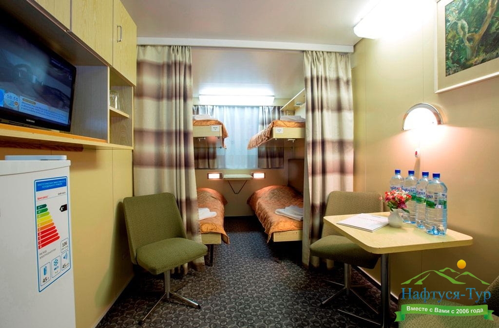 В каюте: четыре спальных места (два внизу, два вторым ярусом), шкаф для одежды, холодильник, телевизор, фен, радио, душ, санузел, кондиционер, два иллюминатора, электророзетка на 220V.