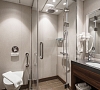 В каюте: панорамные окна, балкон, спутниковое ТВ, шкаф для одежды, холодильник, розетки 220V, телефон, радио, фен, кофемашина, cейф, душ, санузел. Площадь — 46 кв.м. (площадь балкона — 10 кв.м)