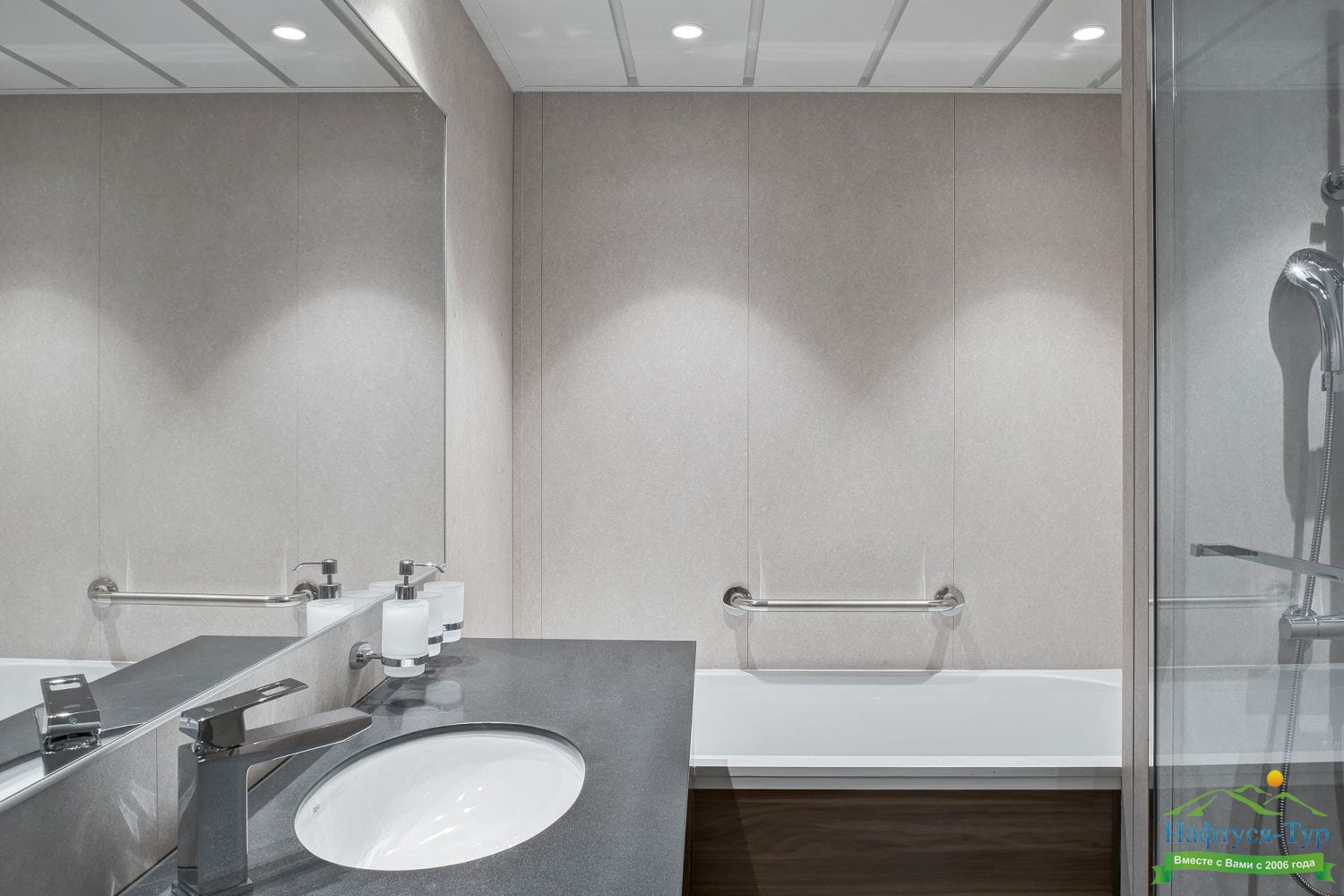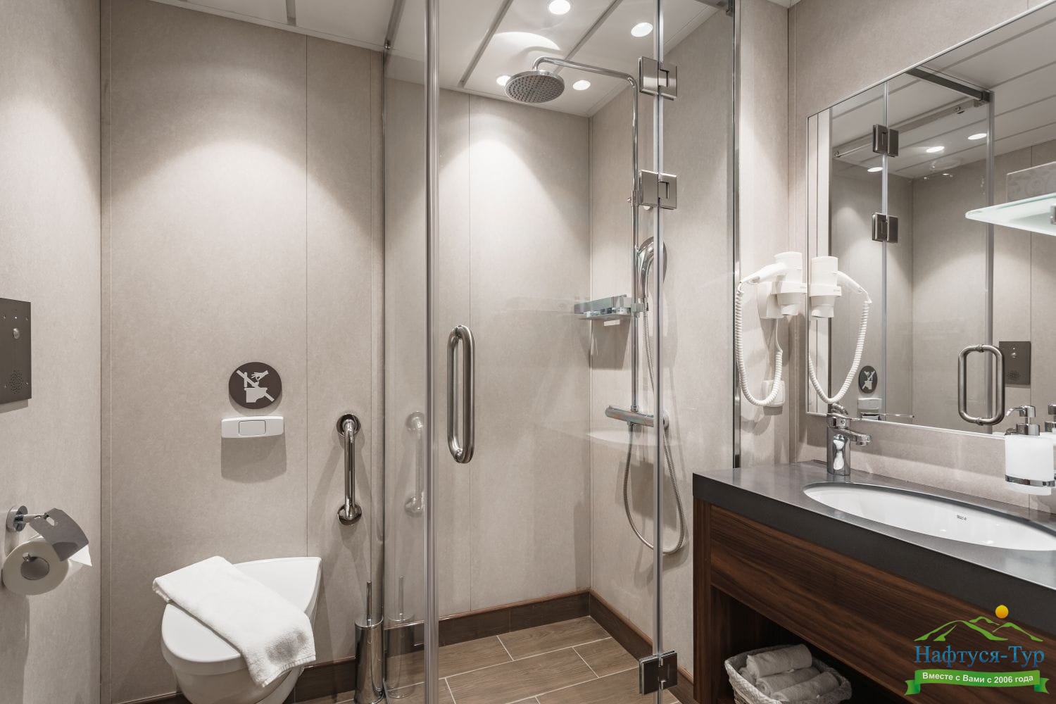 Просторная и комфортабельная каюта на теплоходе с большой, светлой ванной комнатой, балконом и всем необходимым для отдыха