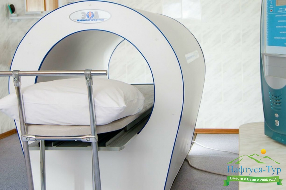 Магнитотурботрон – медицинский аппарат, предназначенный для проведения лечения и профилактики множества заболеваний с помощью одного из видов магнитотерапии (лечения воздействием магнитного поля). Эта аппаратура представляет собой массивную установку, которая создает вращающееся магнитное поле. В начале сеанса, а также в ходе его течения могут устанавливаться и изменяться параметры поля (частота, модуль, индукция), а также направление вращения. Благодаря воздействию генерируемого магнитотурботроном поля, в организме пациента возникают вихревые токи, обеспечивающие улучшение циркуляции крови, ускорение метаболизма, укрепление иммунитета.К несомненным достоинствам предлагаемых санаториями курсов лечения с использованием магнитотурботрона относится многоплановое воздействие на ткани без ограничения по глубине. Курсы такой терапии назначают при бронхитах, пневмонии, астме, остеохондрозах, остеоартрозах и артритах, травмах, синдромах хронической утомляемости, нарушениях в работе сердечнососудистой и нервной систем, ЖКТ, мочеполовых проблемах, заболеваниях кожи, иммунодефицитных и опухолевых заболеваниях.