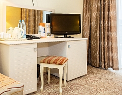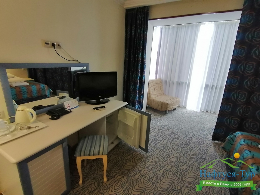 мини-холодильник, сейф, сплит-система, телевизор ЖК, телефон, чайный набор посуды, электрочайник