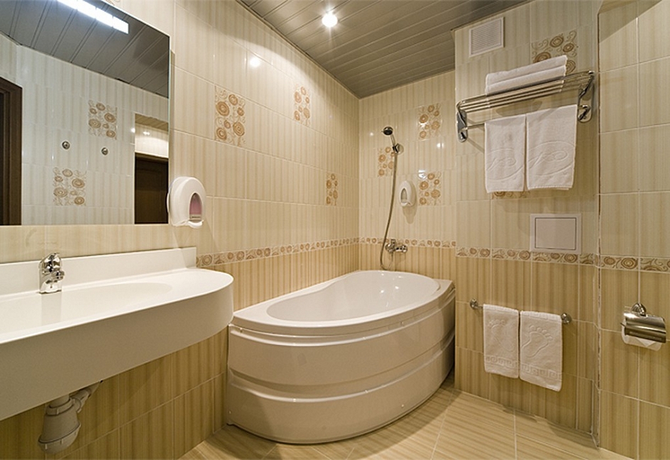 с ванной, тапочки, туалетные принадлежности, фен, халат