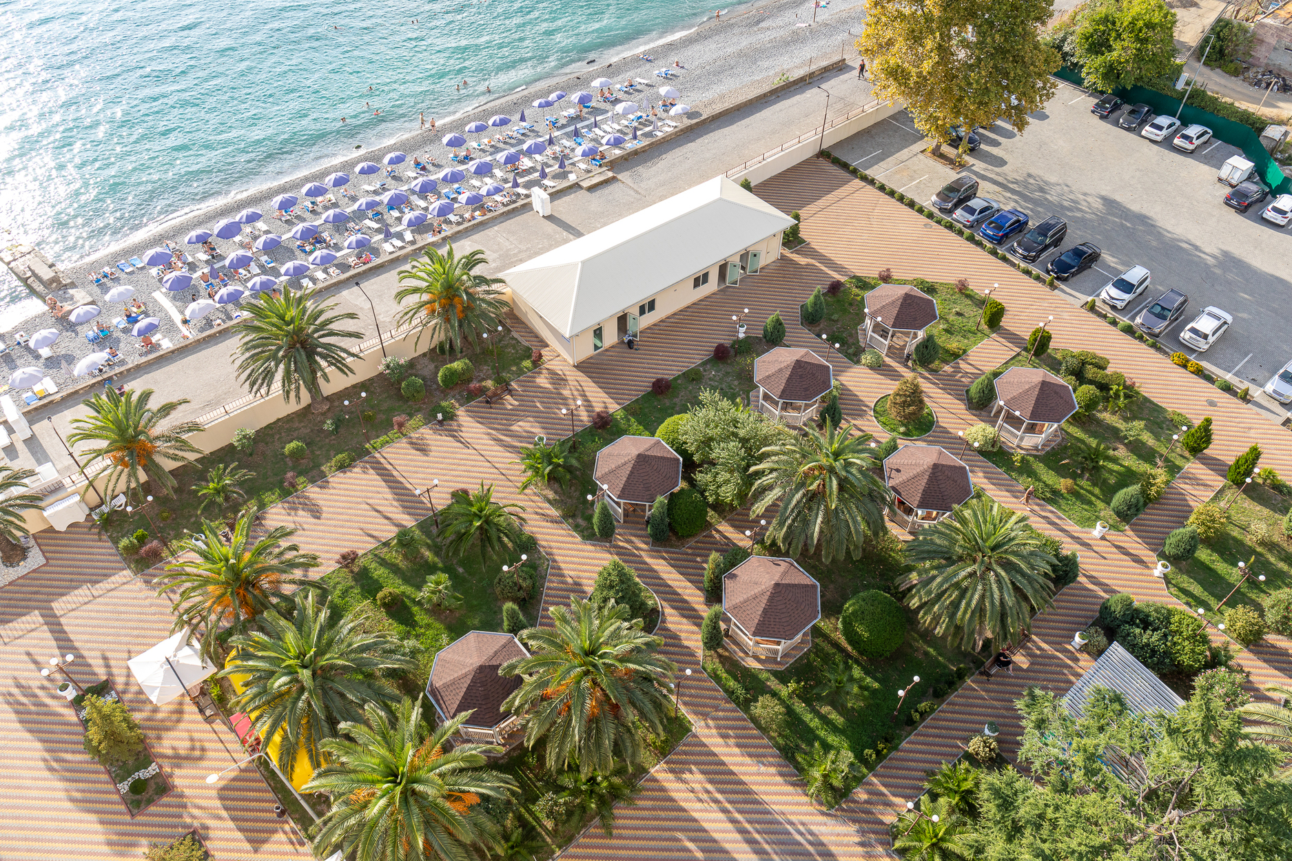 Расположение: Первая линия у моря (50 м до пляжа), 1 км до центра, 42 км до аэропорта Адлер
