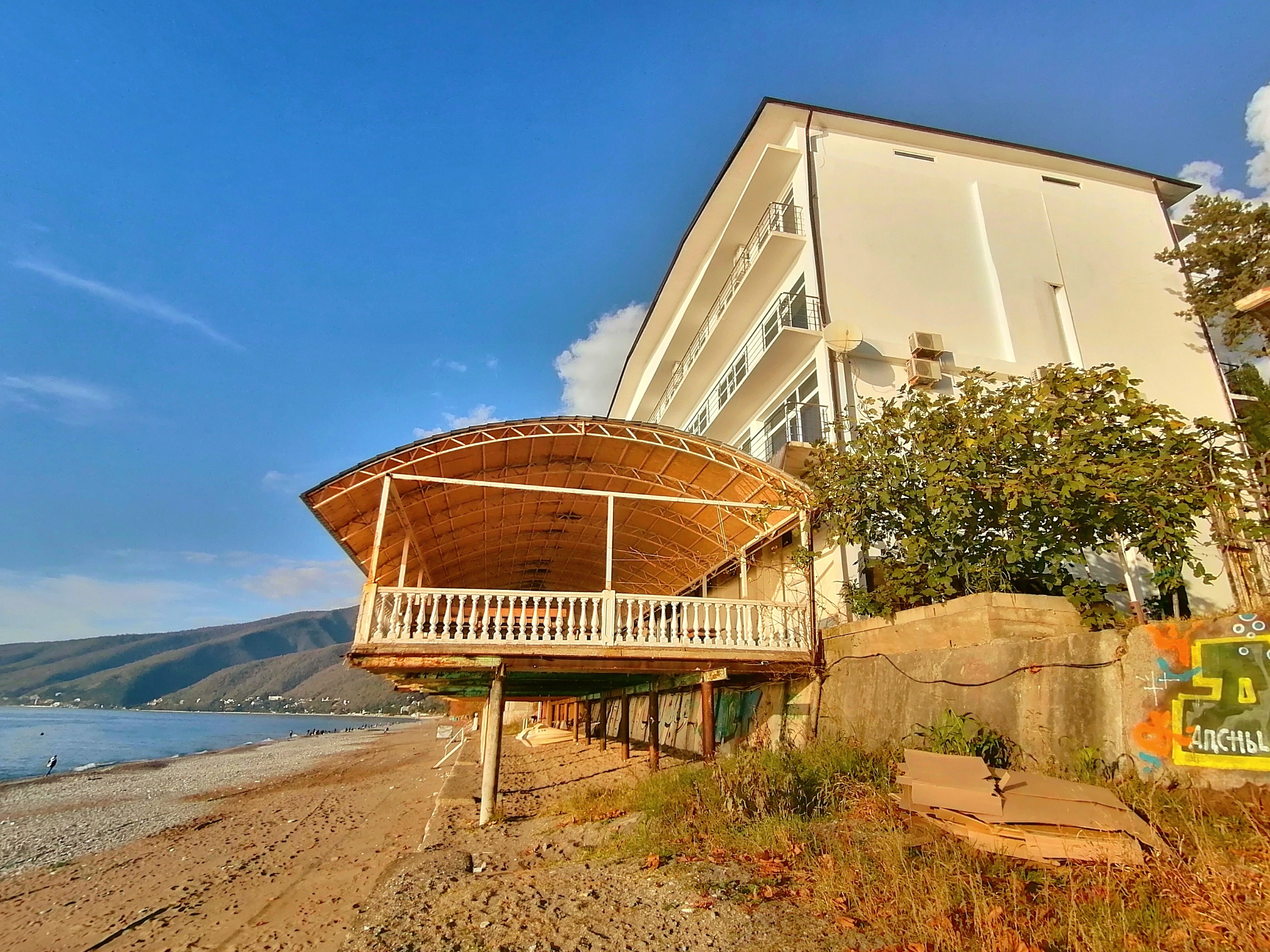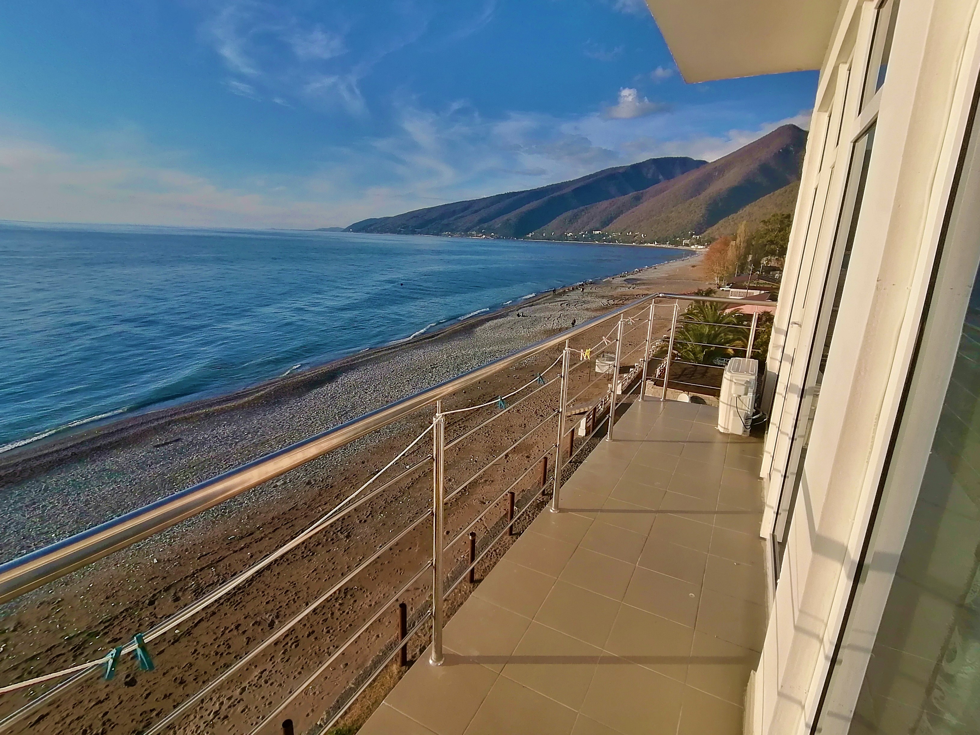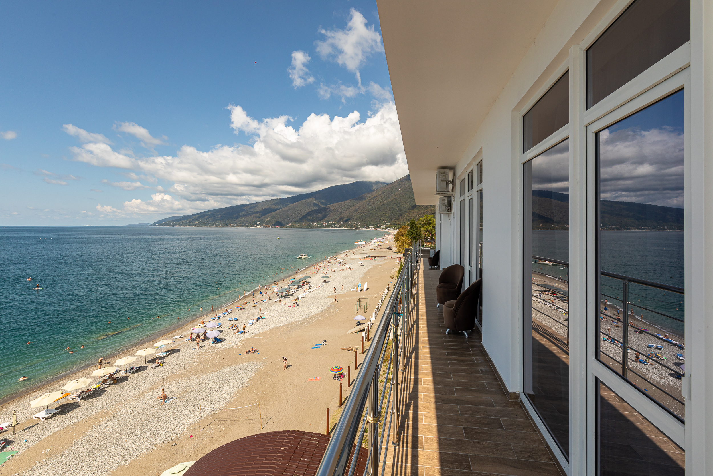 Только что вчера прилетели из Абхазии, жили в Руслане неделю...сначала заселились в номер с видом на горы, потом перешли в номер с видом на море...И тот и другой вид просто супер! Большое панорамное окно вовсю стену, лежишь на кровати и смотришь как плещутся волны.