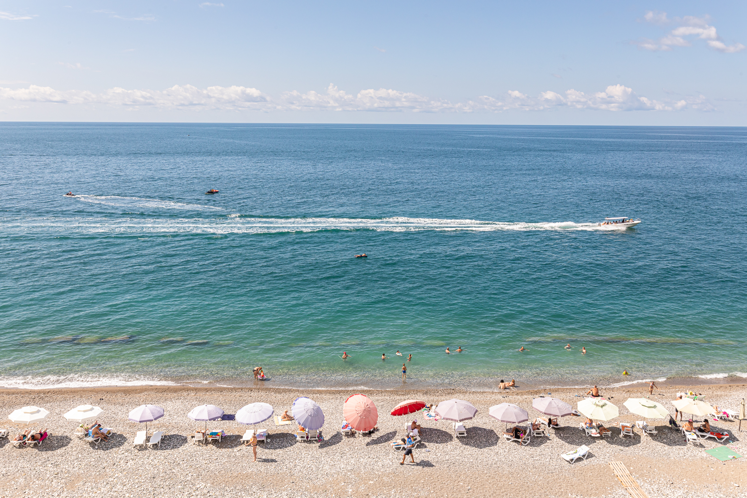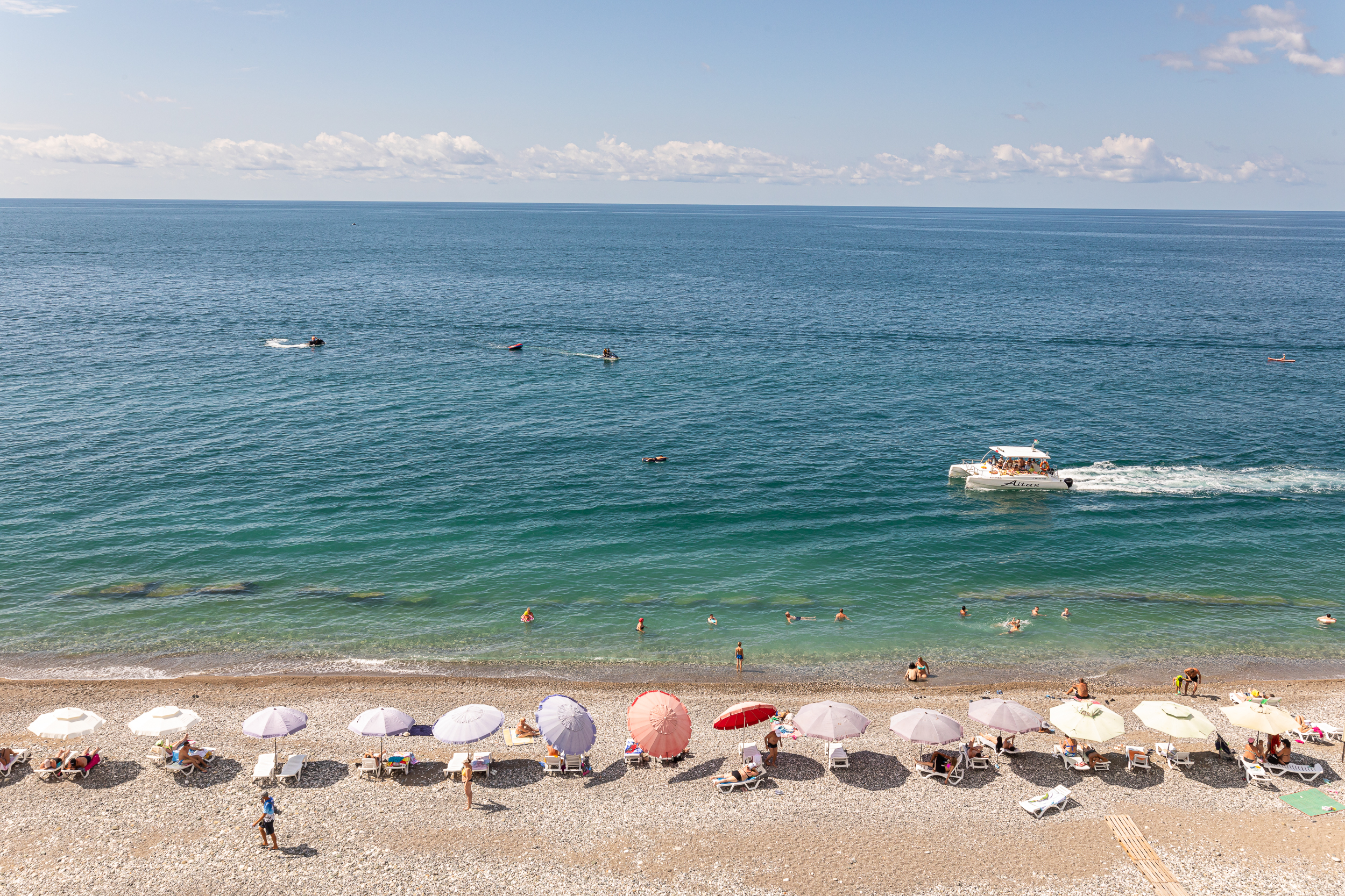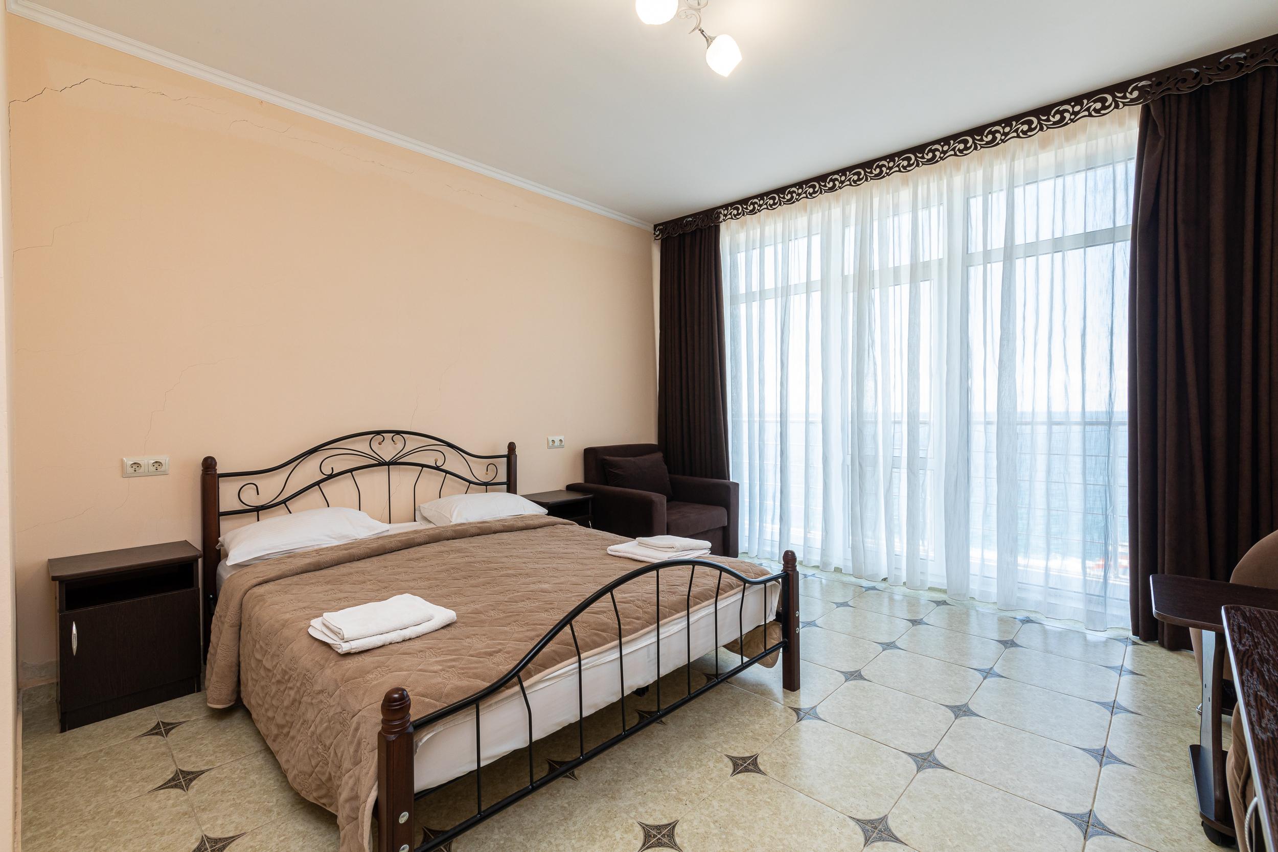 Только что вчера прилетели из Абхазии, жили в Руслане неделю...сначала заселились в номер с видом на горы, потом перешли в номер с видом на море...И тот и другой вид просто супер! Большое панорамное окно вовсю стену, лежишь на кровати и смотришь как плещутся волны.