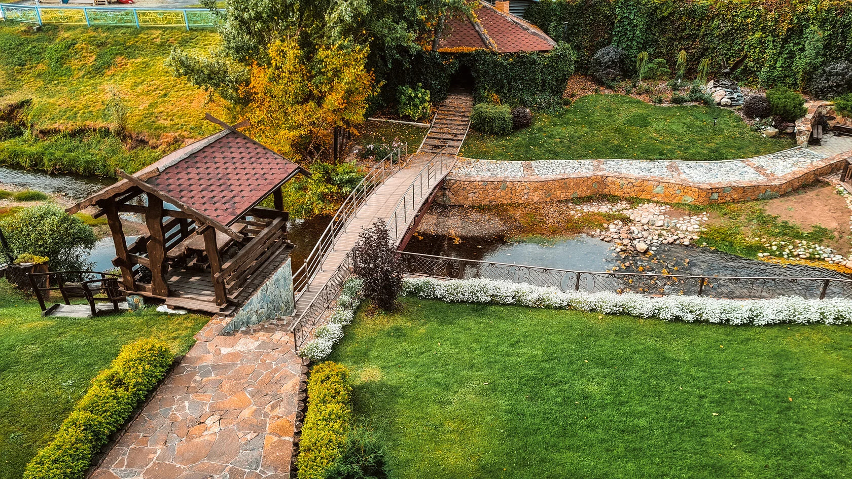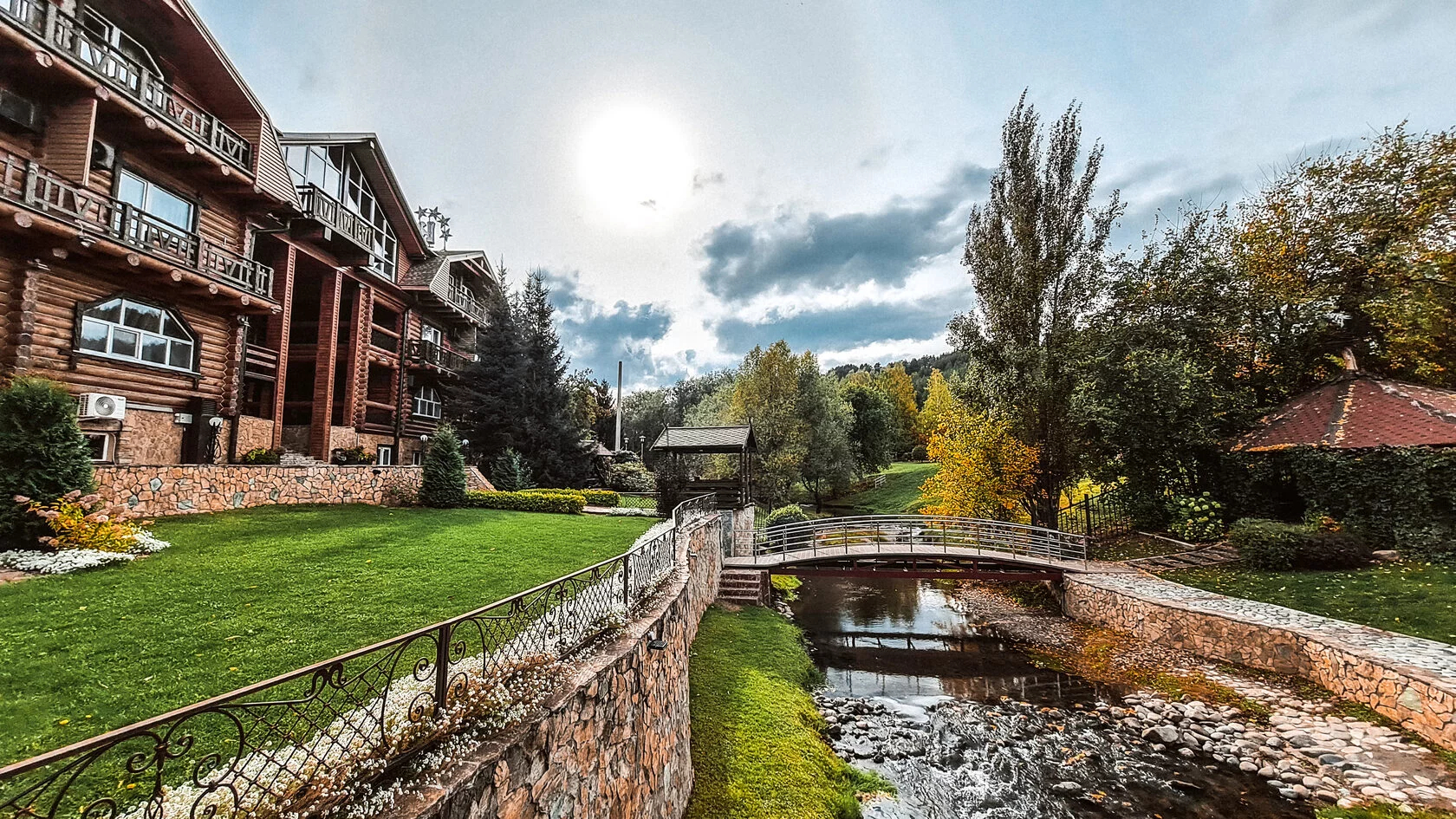 Отель, окруженный благоустроенным парком с сетью дорожек, качелями и беседками, с широкой террасой, примыкающей к озеру, и собственной вертолетной площадкой, построен из древесины сосны. Роскошный, тщательно продуманный интерьер сделает Ваш семейный отдых комфортным, уютным и беззаботным.