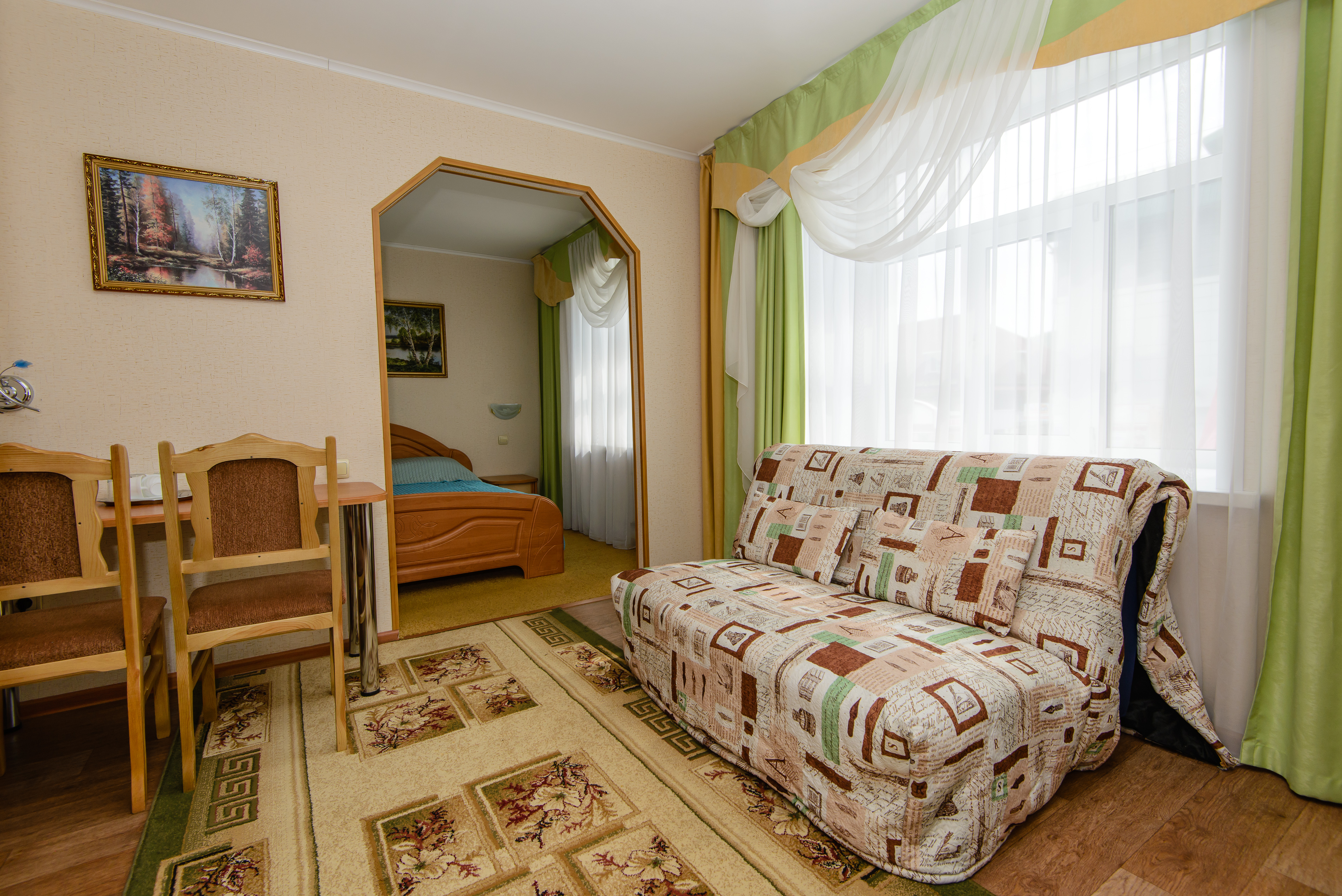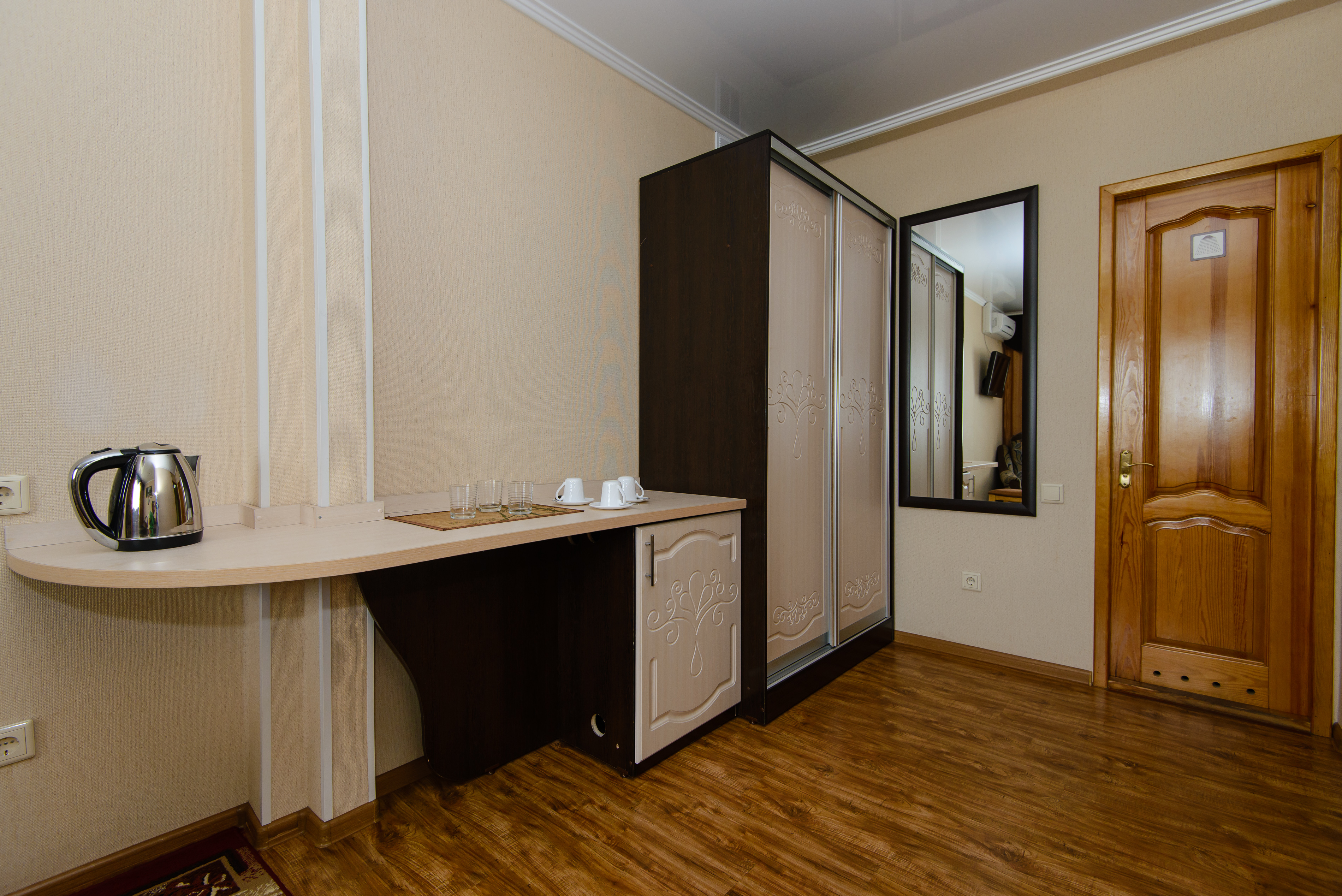 вешалка, диван раскладной, зеркало, кровать двуспальная, прикроватные тумбочки, стол, шкаф