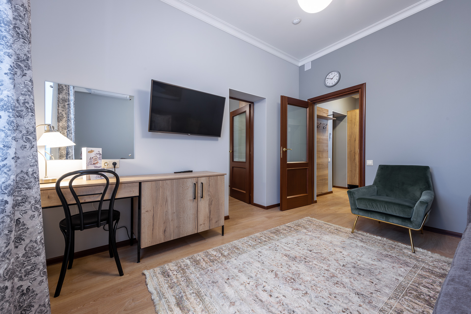 вешалка, диван раскладной, кровать двуспальная, прикроватные тумбочки, стол, столик туалетный, стулья, тумба, шкаф