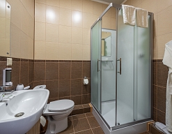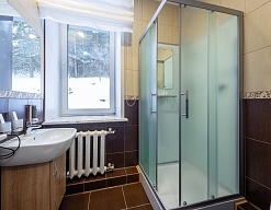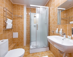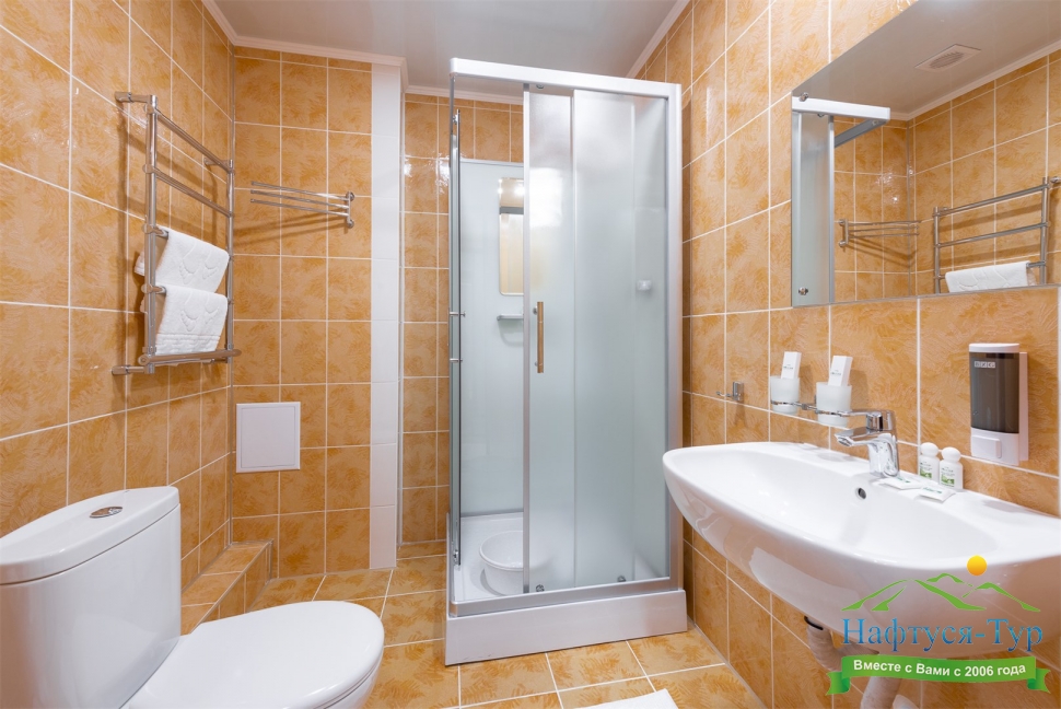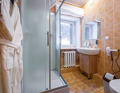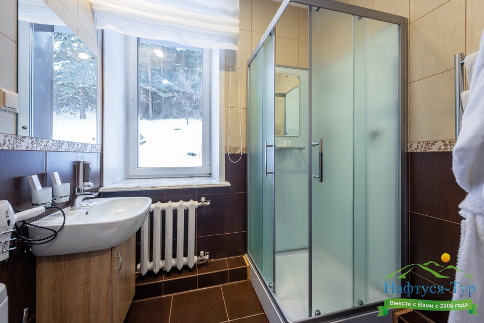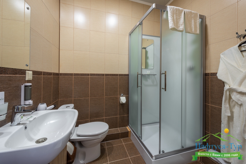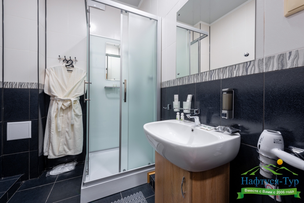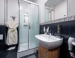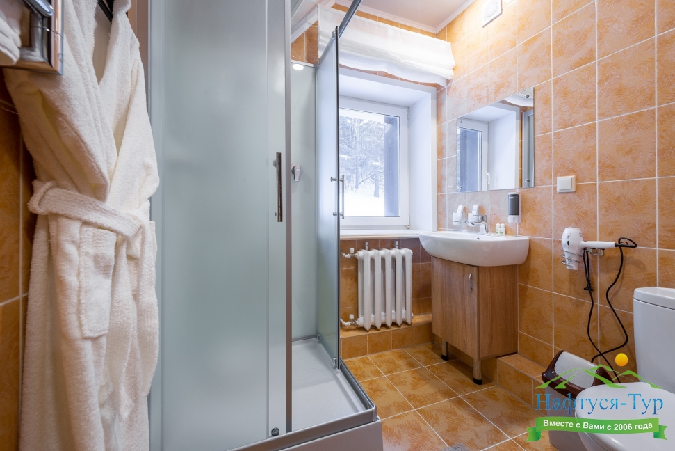 с душевой кабиной, тапочки, туалетные принадлежности, фен, халат