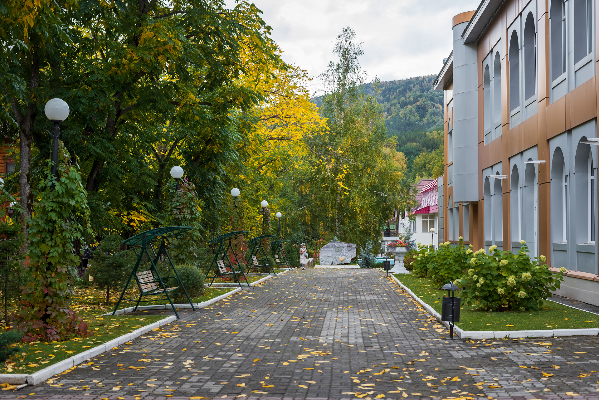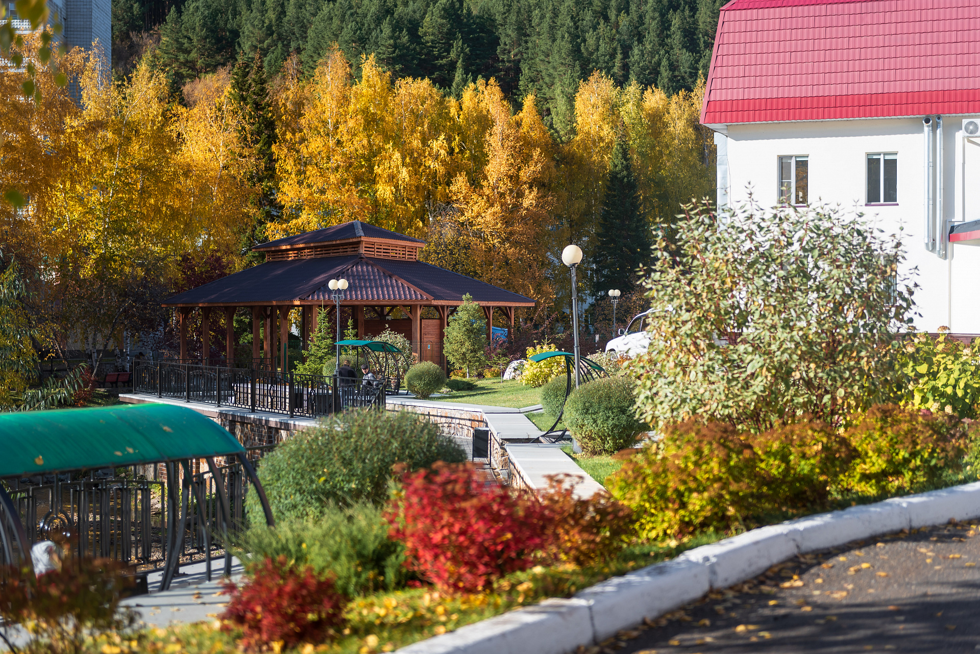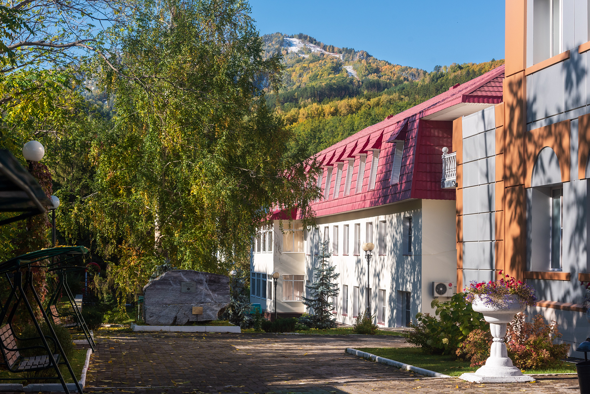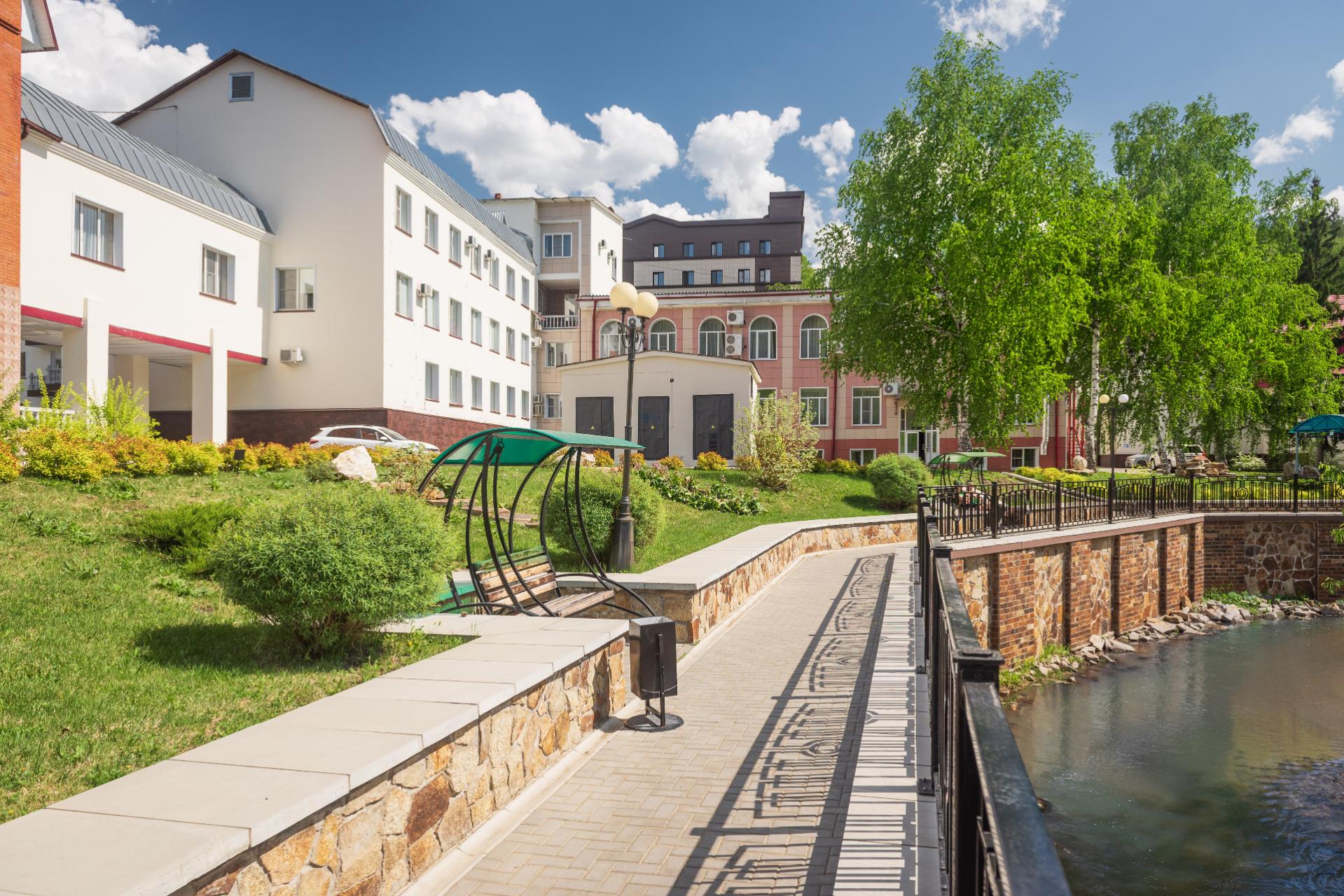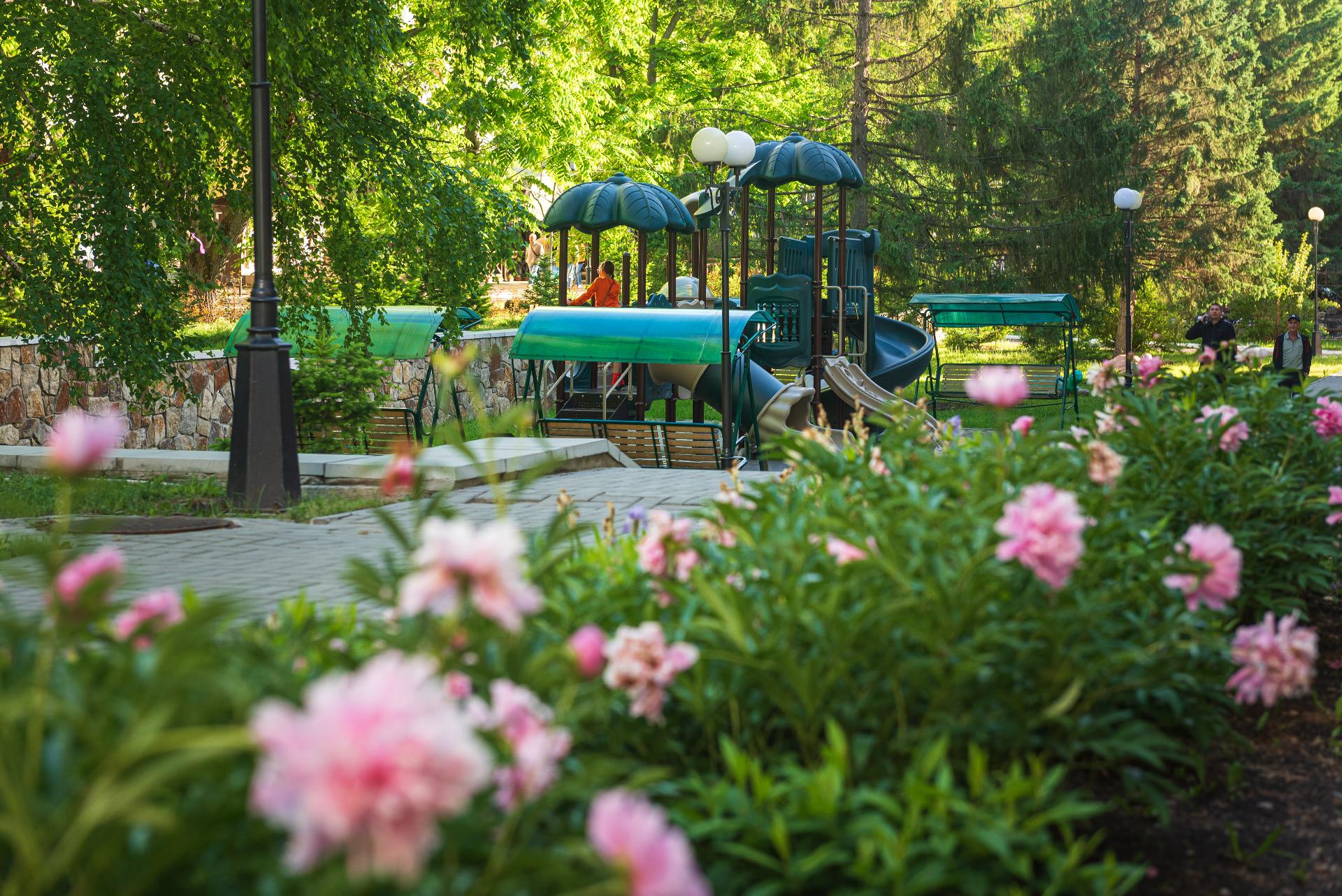 Территория санатория "Центросоюза" в Белокурихе прекрасно благоустроена: здесь можно прогуляться по живописным тропинкам, посетить спортивные и детские площадки, отдохнуть у воды. Также в распоряжении гостей работает ресторан с великолепной кухней, где подают блюда местной и европейской кулинарной традиции.