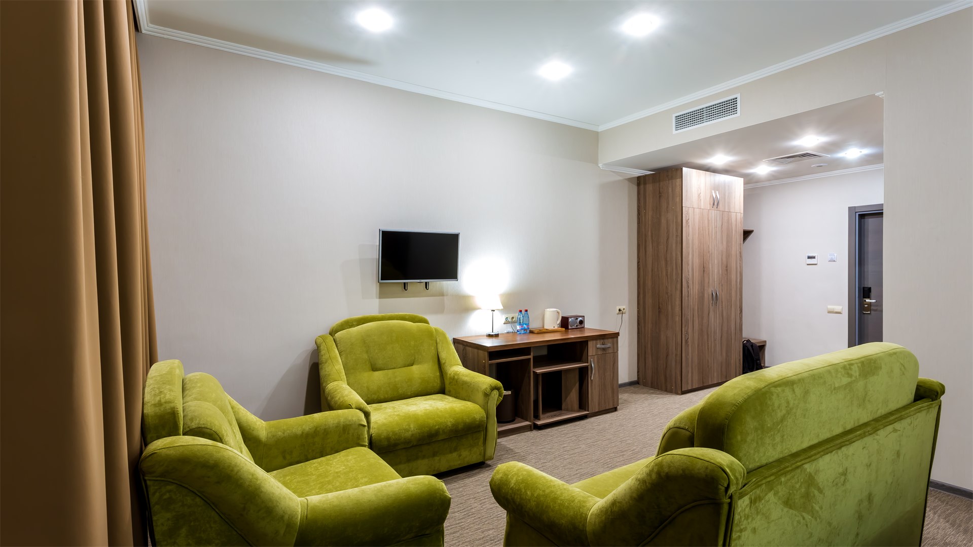 мини-холодильник, сейф, сплит-система, телевизор ЖК, телефон, чайный набор посуды, электрочайник