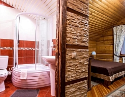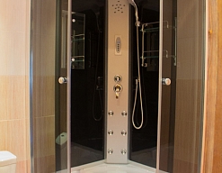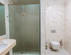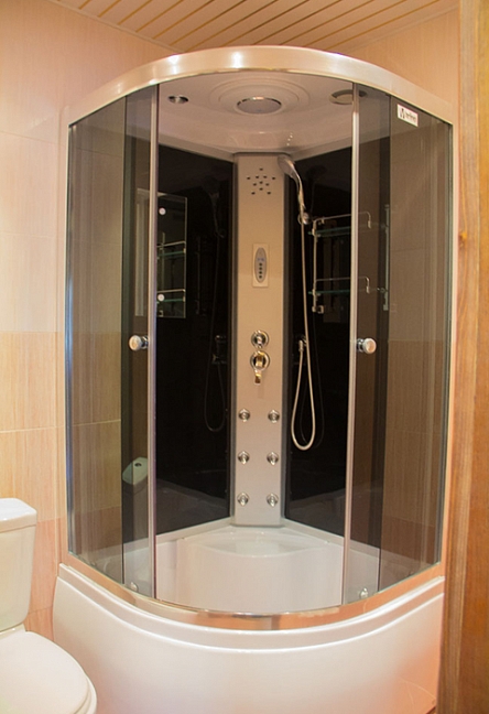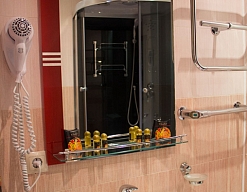 с душевой кабиной, тапочки, туалетные принадлежности, фен, халат