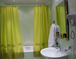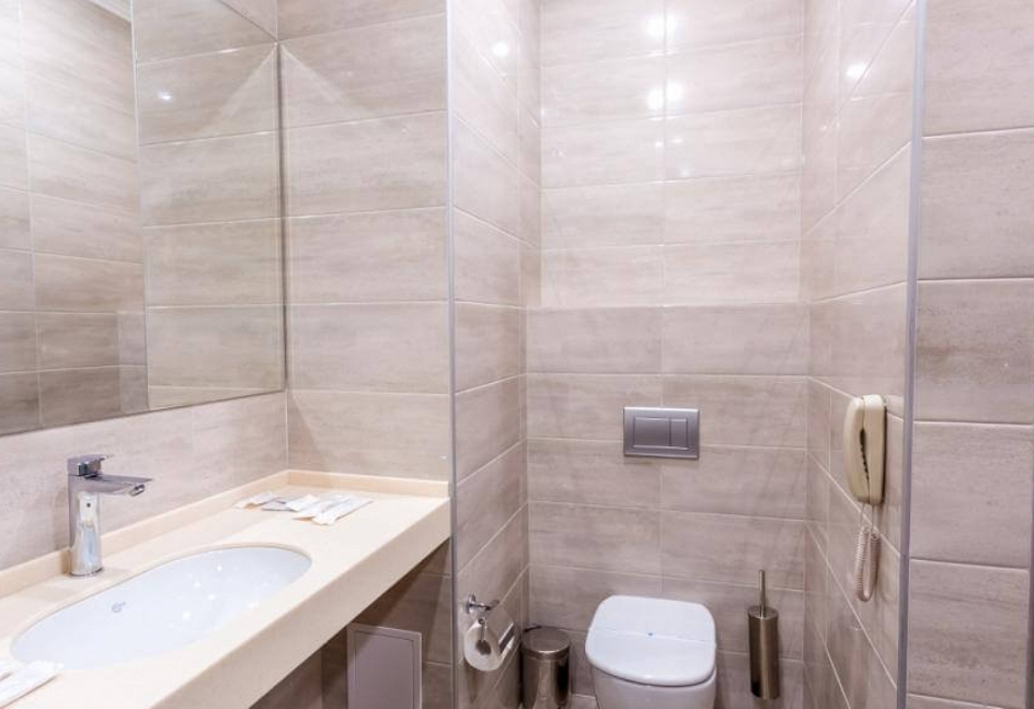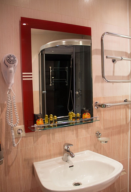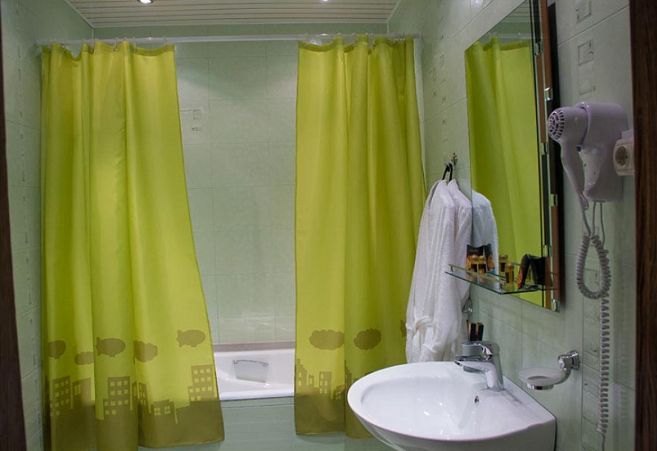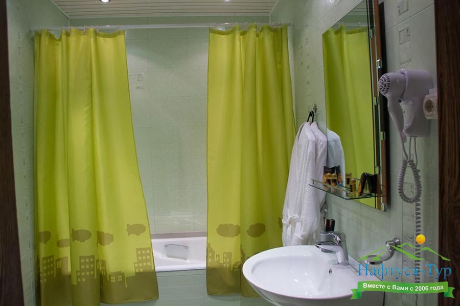 с душем, тапочки, туалетные принадлежности, фен, халат