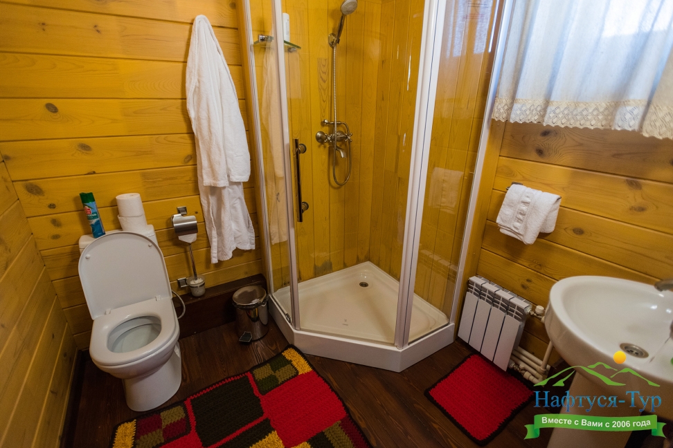 с душем, тапочки, туалетные принадлежности, фен, халат