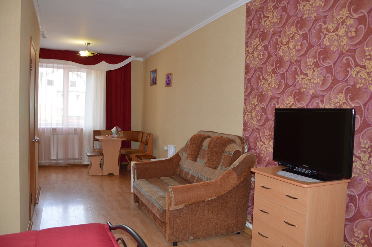 В нашем уютном номере в качестве оснащения мы предлагаем кровать односпальную (130*200см), комод, журнальный столик, обеденную зону, бра, также душевую и туалет