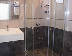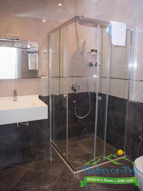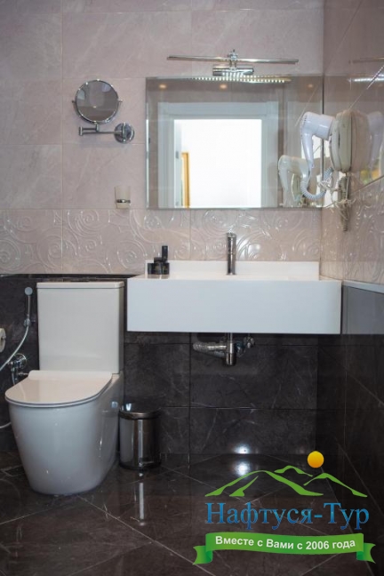 с душем, тапочки, туалетные принадлежности, фен, халат