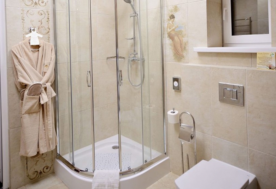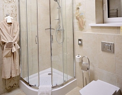 с душевой кабиной, тапочки, туалетные принадлежности, фен, халат
