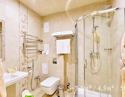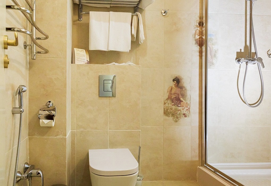 биде, с душевой кабиной, тапочки, туалетные принадлежности, фен, халат