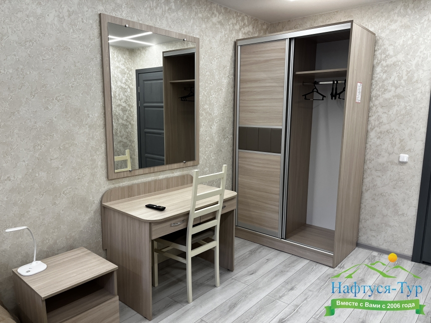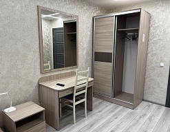 вешалка, зеркало, кровати односпальные /одна двуспальная кровать, прикроватные тумбочки, стол, стулья, шкаф