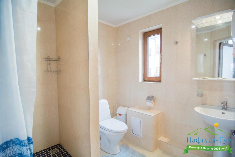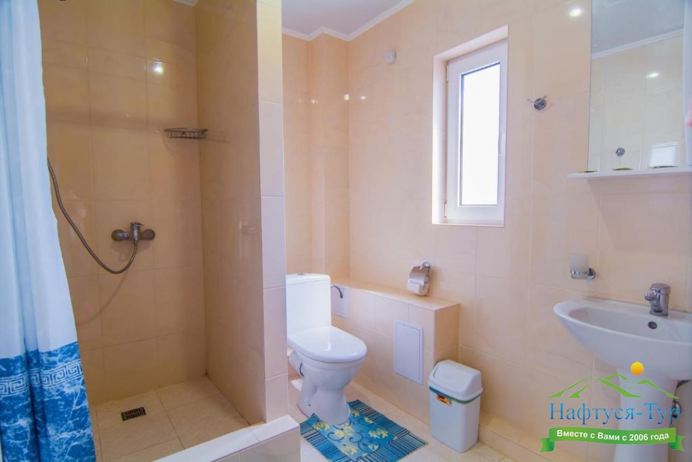 с душем, тапочки, туалетные принадлежности, халат