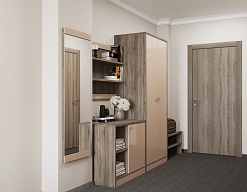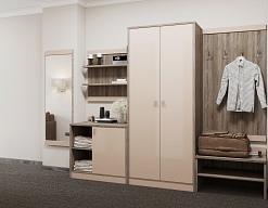 вешалка, зеркало, кровати односпальные /одна двуспальная кровать, прикроватные тумбочки, стол, стул, шкаф