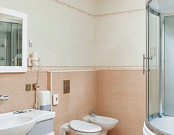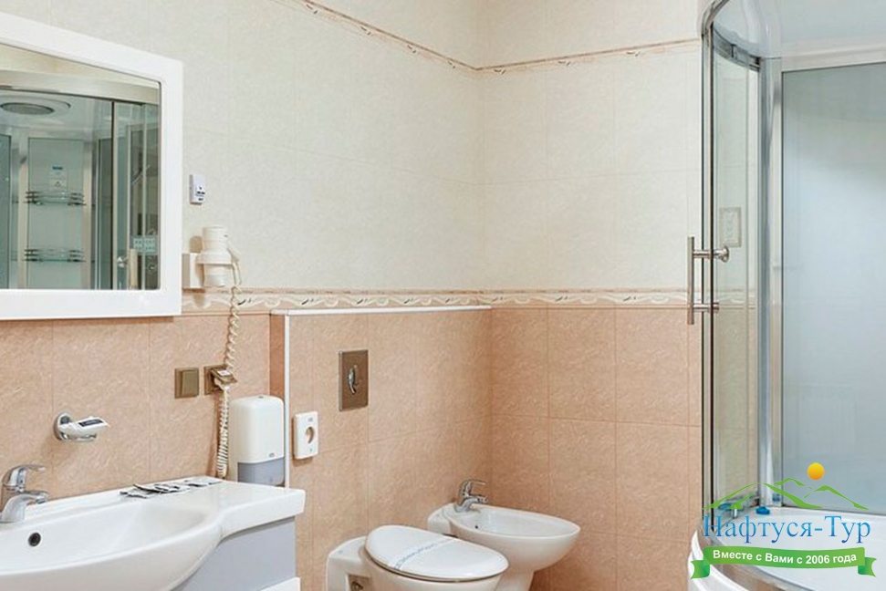 с душевой кабиной, тапочки, туалетные принадлежности, фен