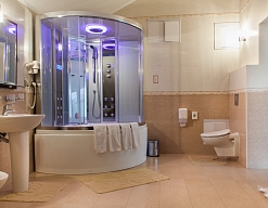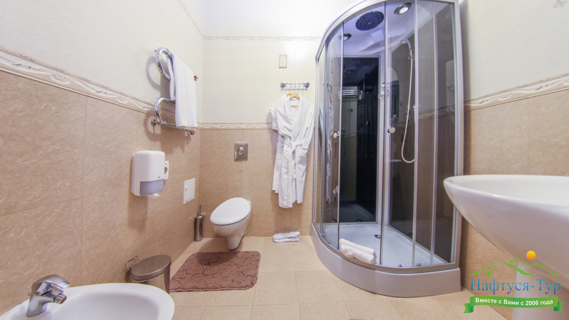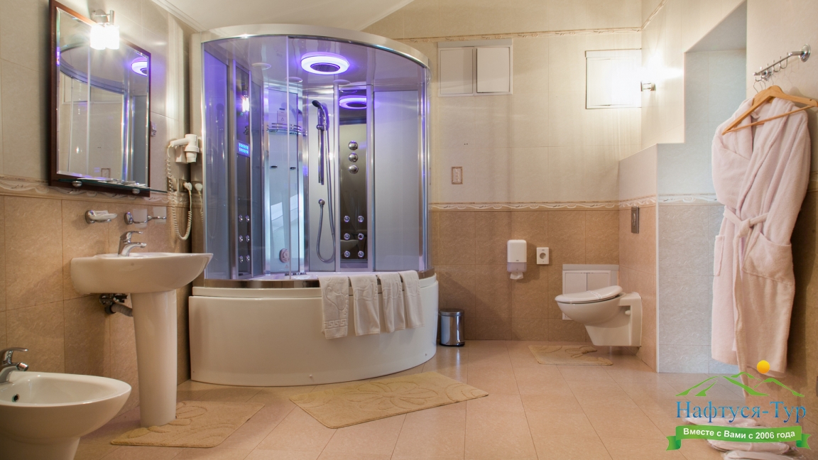 с душевой кабиной, тапочки, туалетные принадлежности, фен, халат