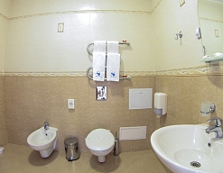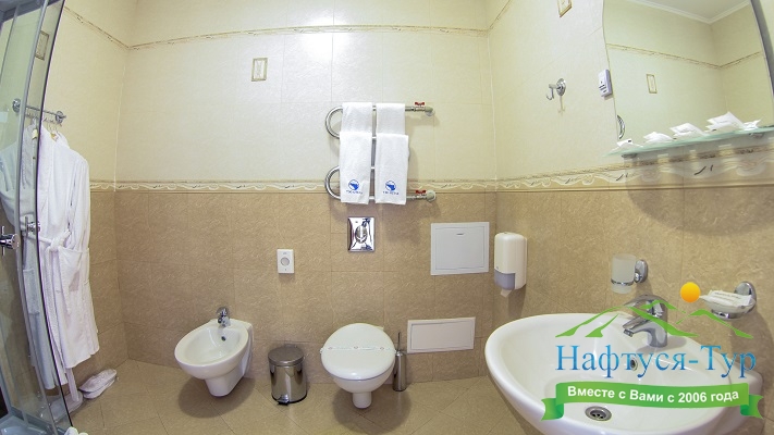 с ванной, тапочки, туалетные принадлежности, фен, халат