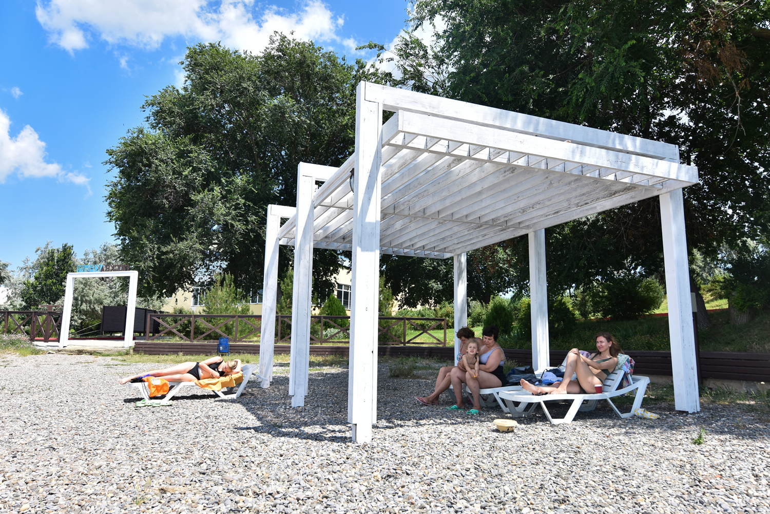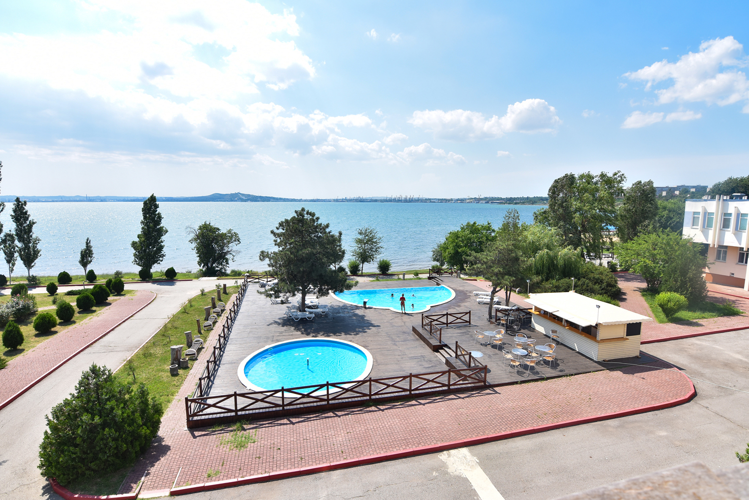 Мы предпочитали отдыхать на гальке или у бассейна. Бассейнов 2, один из них детский, 50 см, пример-но. Странно, что вода в детском бассейне холоднее и в него нет ступенек, даже взрослому неудобно в него спу-ститься, дети в него только прыгают. Взрослый бассейн небольшой, но уютный, вода чистая, за версту хлоркой пахнет). Если в него набежали дети из лагерей, которых одновременно не менее 3-х, то остальные отдыхающие сидят в сторонке - дети прыгают и шумят. Вечером оба бассейна подсвечиваются, красиво.
