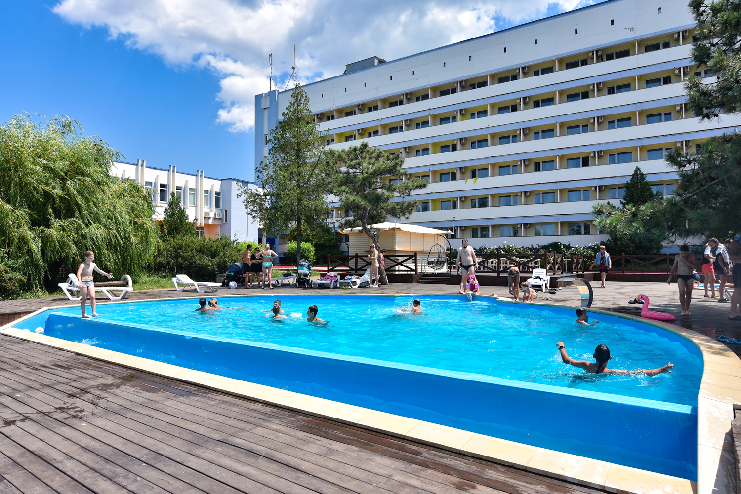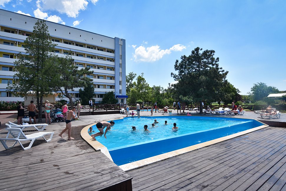 Ужасный санаторий, начиная от номеров, заканчивая морем. Антисанитария в бассейне, купаются все кому не лень, приходят местные жители купаются в бассейне, шезлонгов не хватает, потому что на территории санатория куча посторонних лиц.