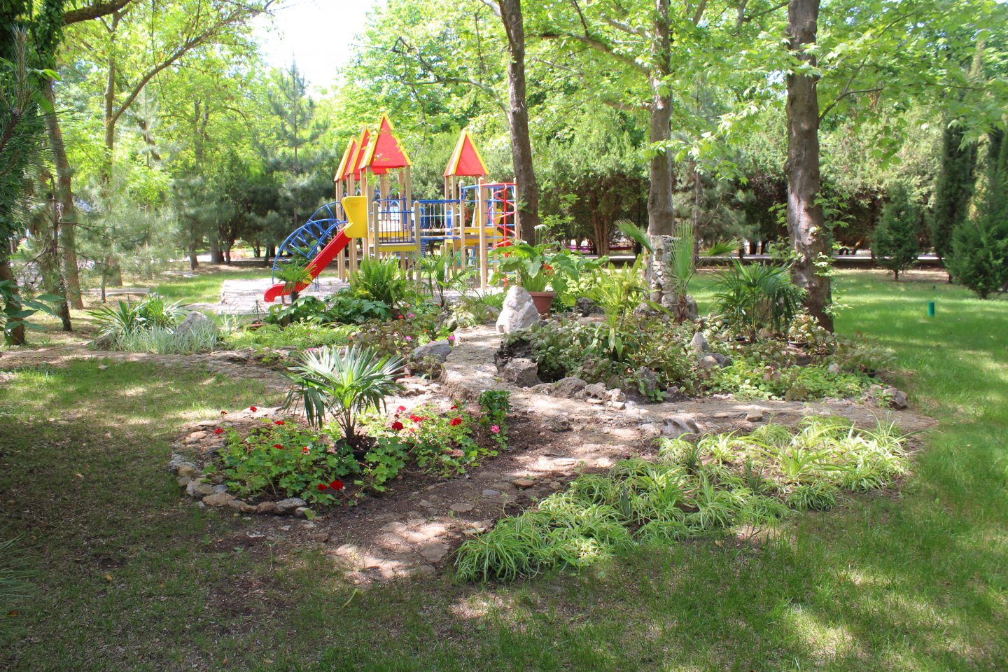 Территория пансионата утопает в зелени более чем двух десятков видов хвойных и лиственных пород деревьев и кустарников.