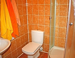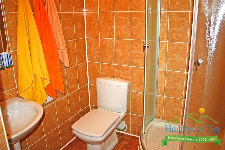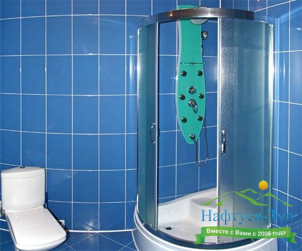 с душевой кабиной, тапочки, туалетные принадлежности, фен, халат