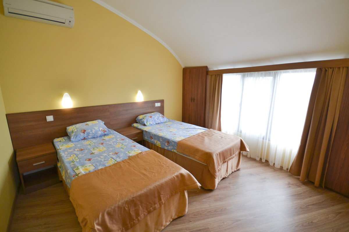 Для вашего комфортного проживания мы рады предоставить вам хорошо оборудованные 1-местные, 2-местные и 2-комнатные номера различных категорий. В номерах вы можете найти все, что вам необходимо для комфортного проживания: современная мебель, санузел, чайник, холодильник, телевизор, сейф и кондиционер. С балконов открывается незабываемый вид на море и горы. На всей территории гостиницы имеется скоростной wi-fi.