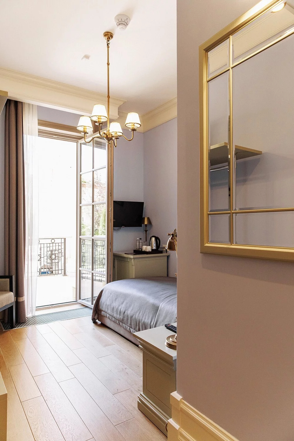 вешалка, диван, зеркало, кровать двуспальная, прикроватная тумбочка, стол, стулья, шкаф