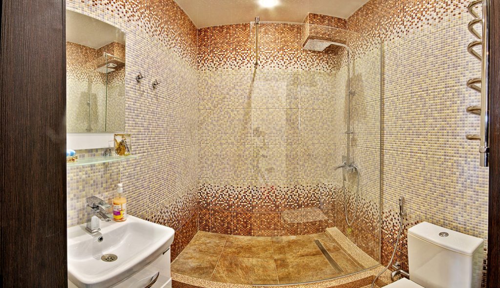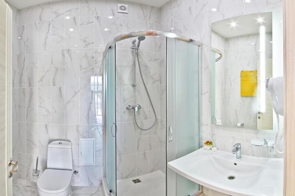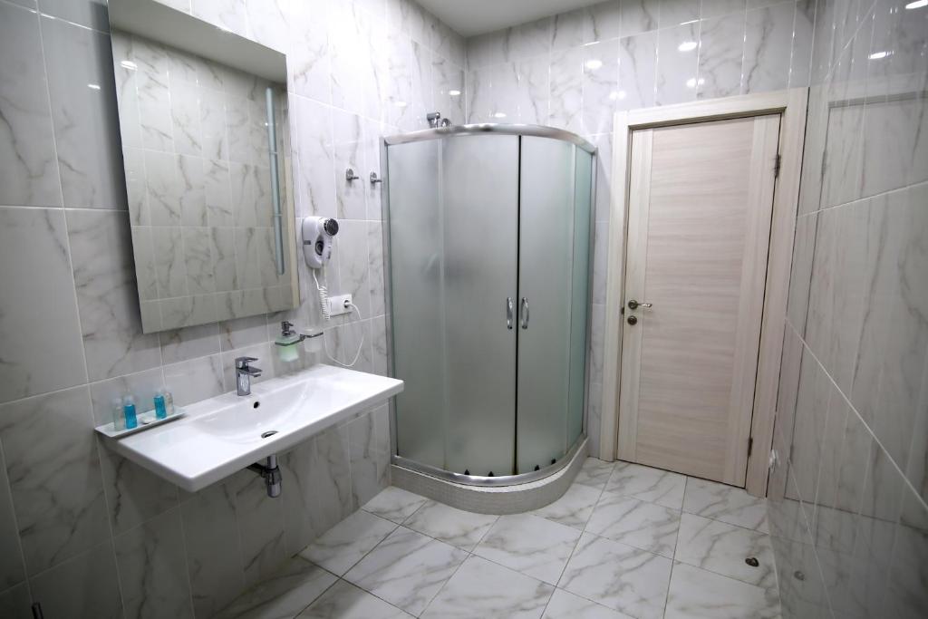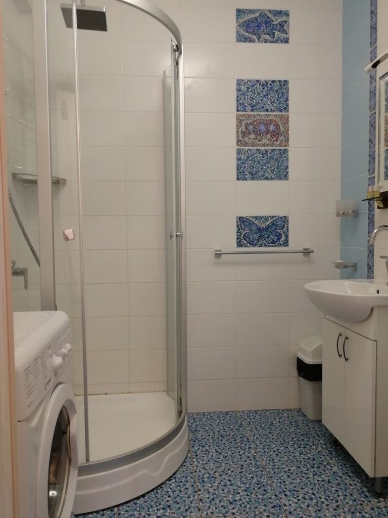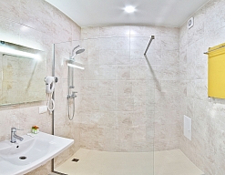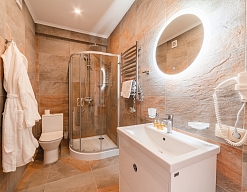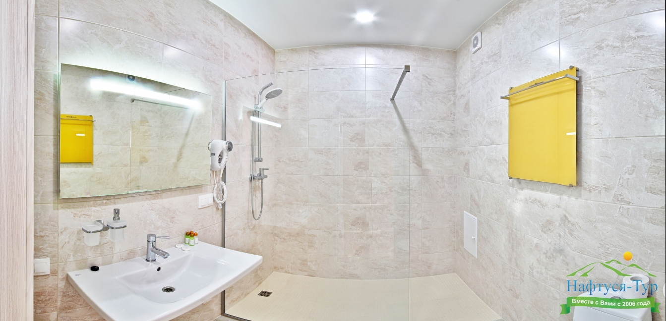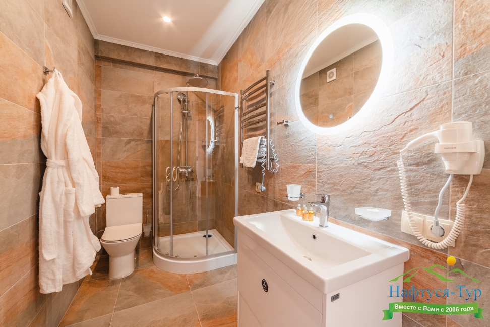 с душем, тапочки, туалетные принадлежности, фен, халат