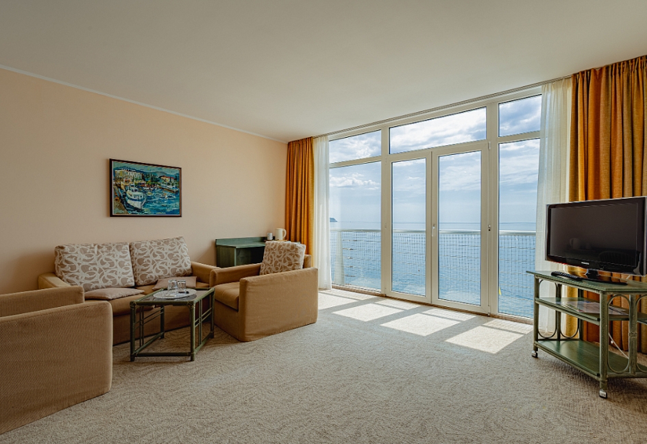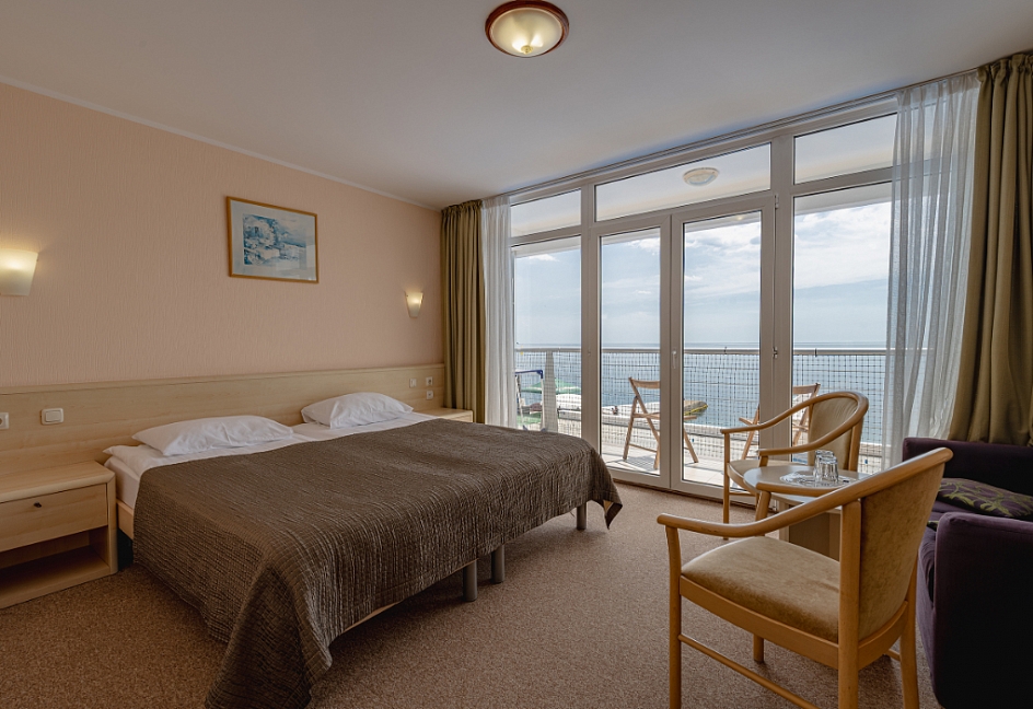 Отель находится в Приморском парке на берегу моря. Подкупили меня утренние виды из окна и ночной шум моря.Обслуживание на высоте.Отличные завтраки и ужины. Ресторан с террасой уютные.Достойный номер,много света,воздуха.