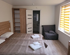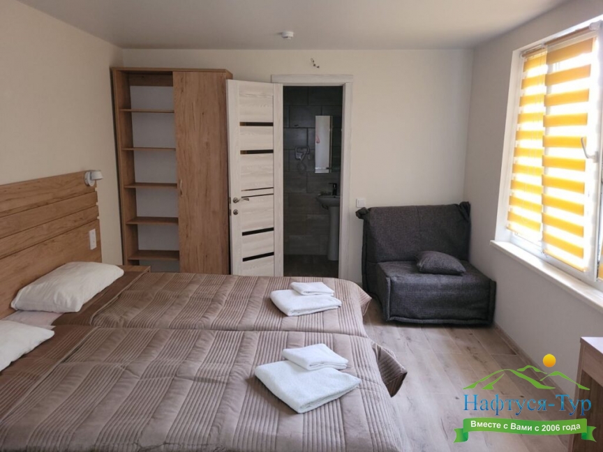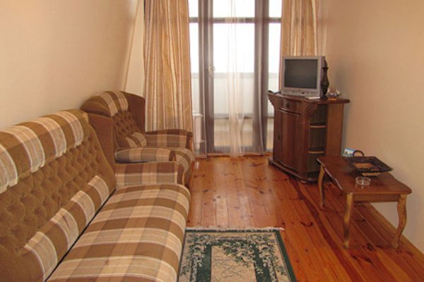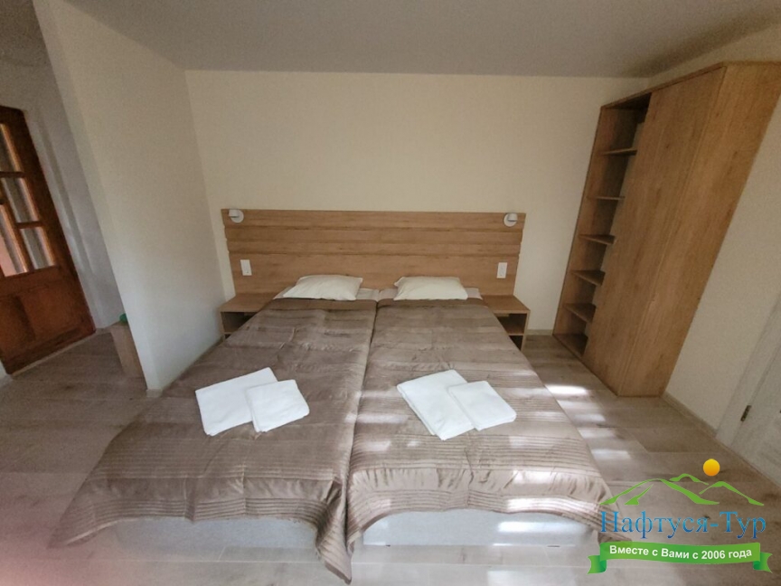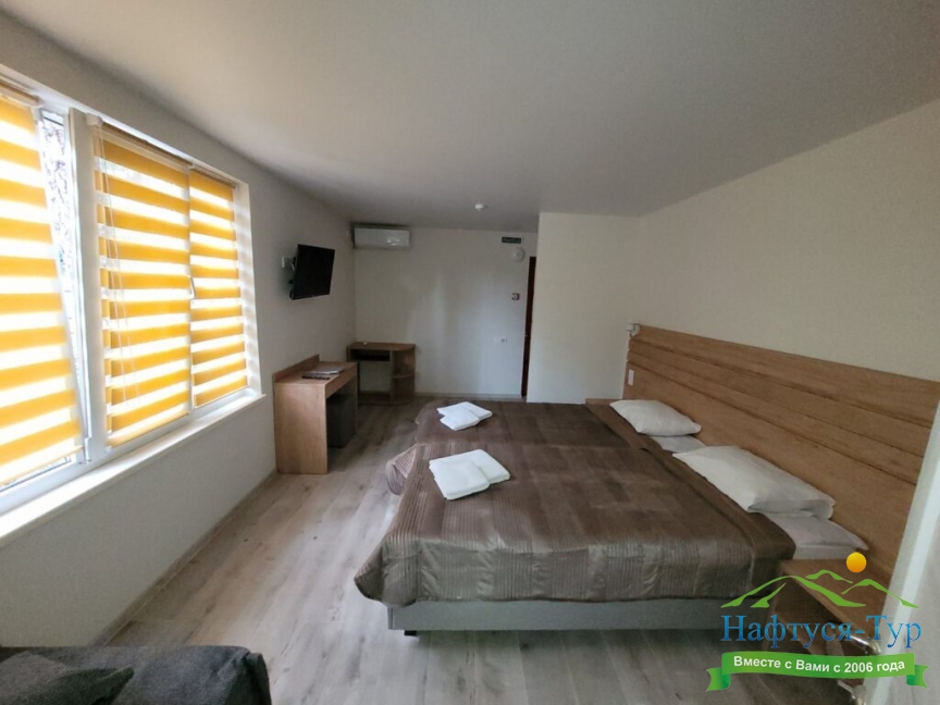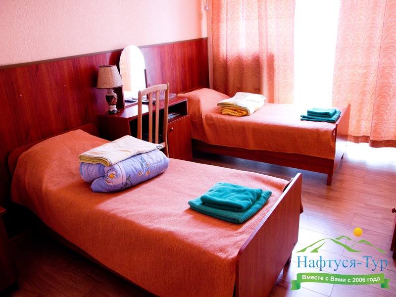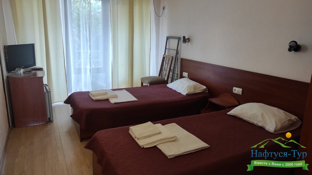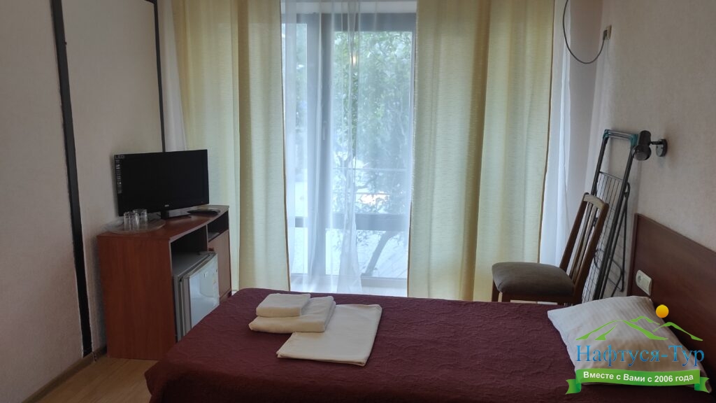 По прибытию заселились в номере стандарт-А, вид на море замечательный. Пансионат полностью соответствует заявленному на сайте "Нафтуся тур". Участок гостиницы ухоженный, видно, что за ним постоянно следят.