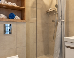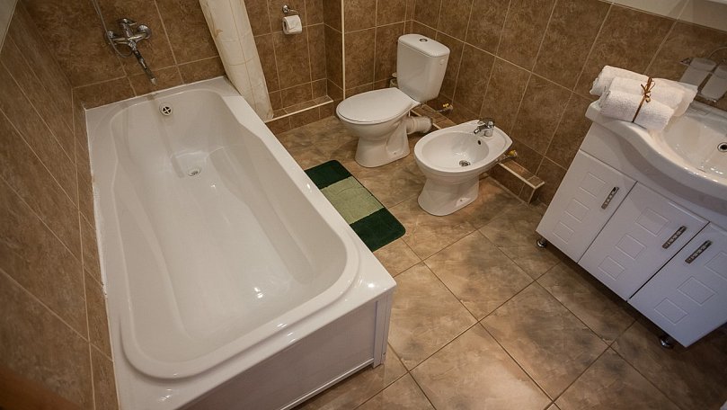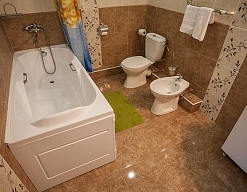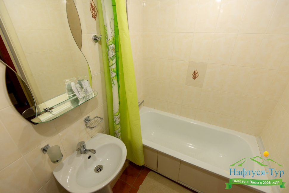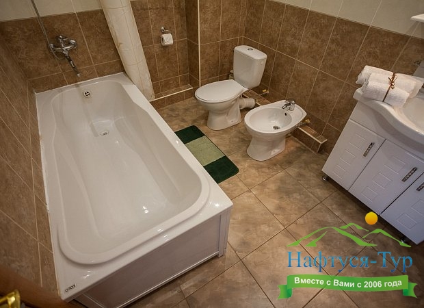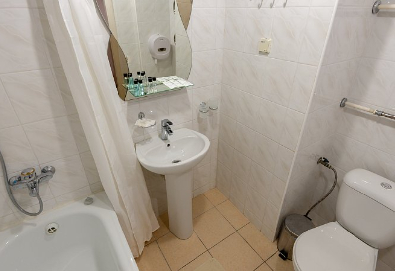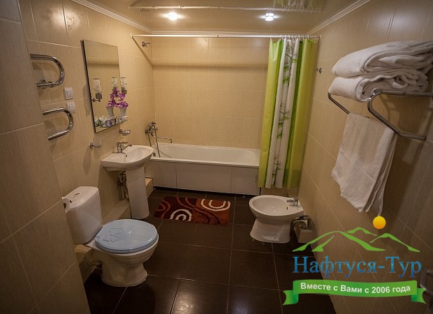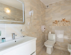 с душем или ванной, туалетные принадлежности, фен, халат
