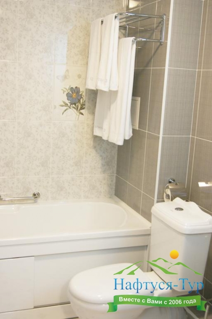 с ванной, тапочки, туалетные принадлежности, фен, халат