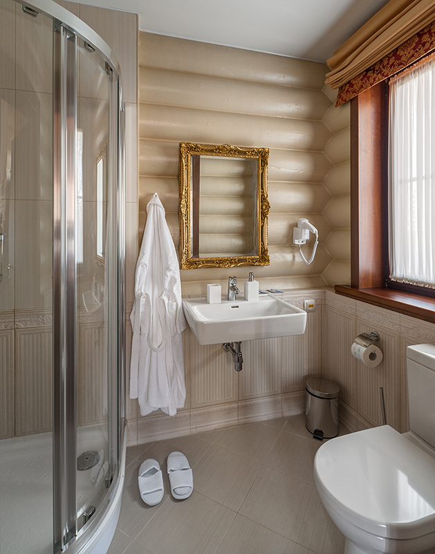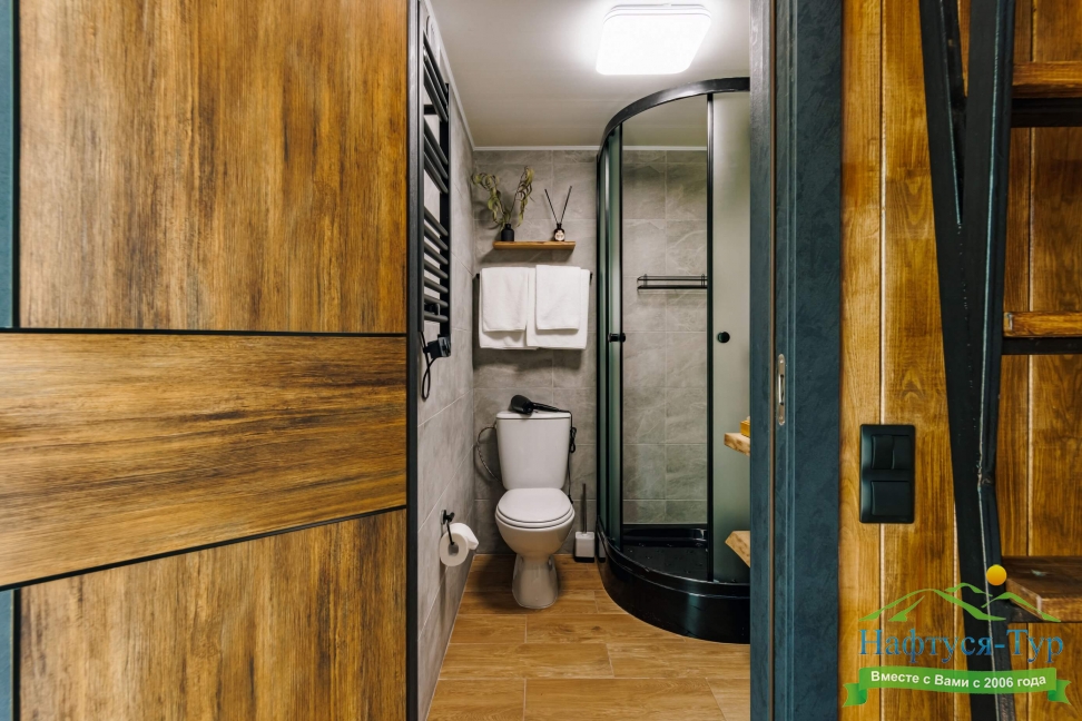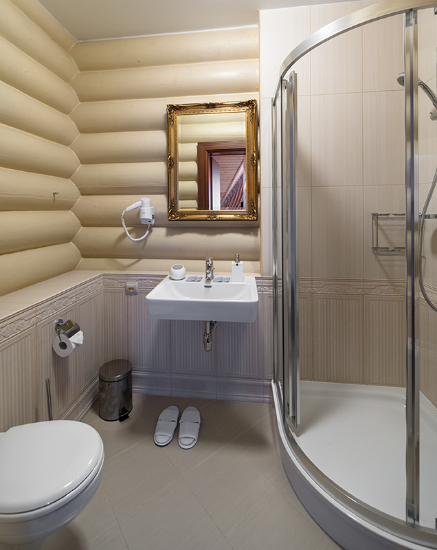 с душевой кабиной, тапочки, туалетные принадлежности, фен