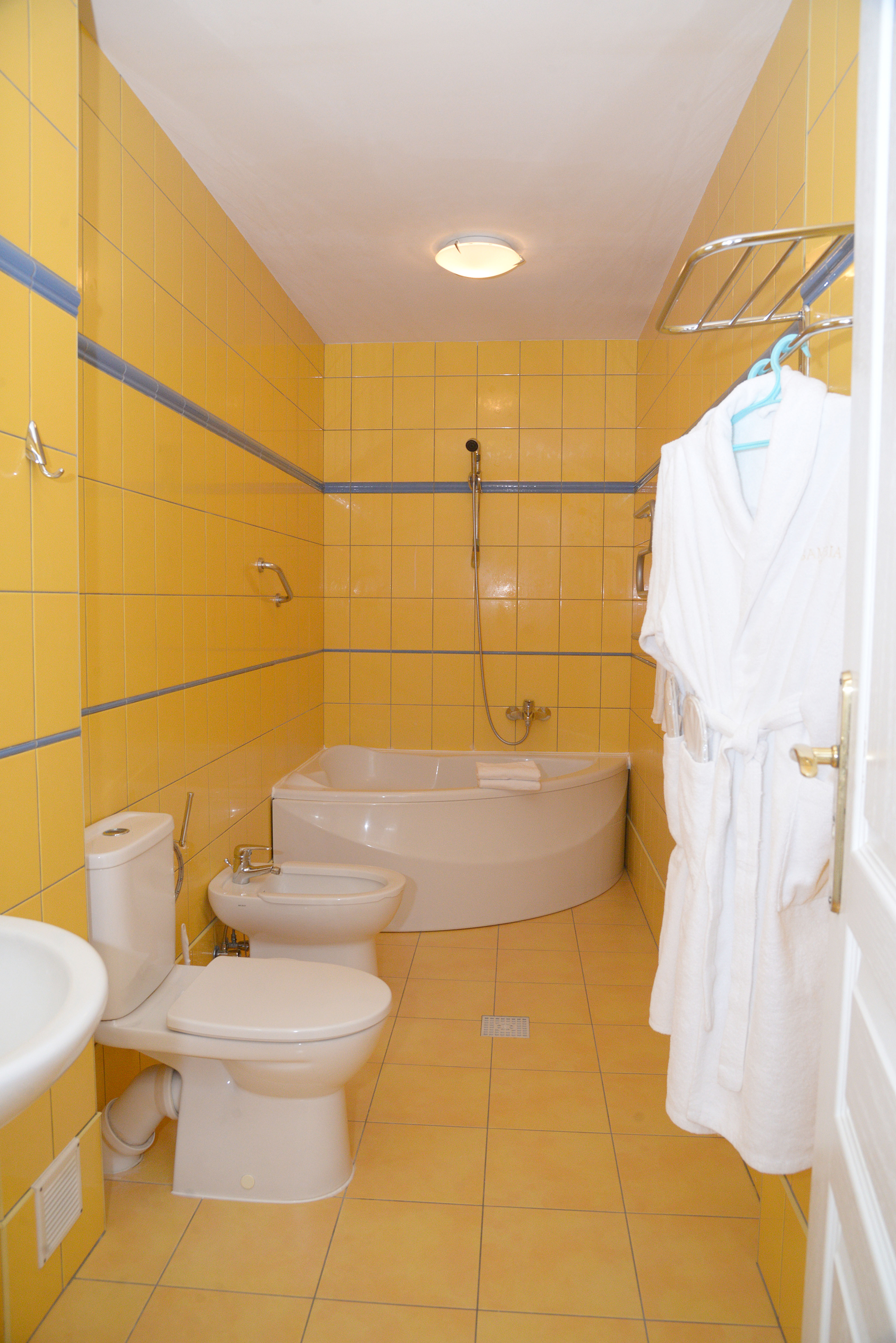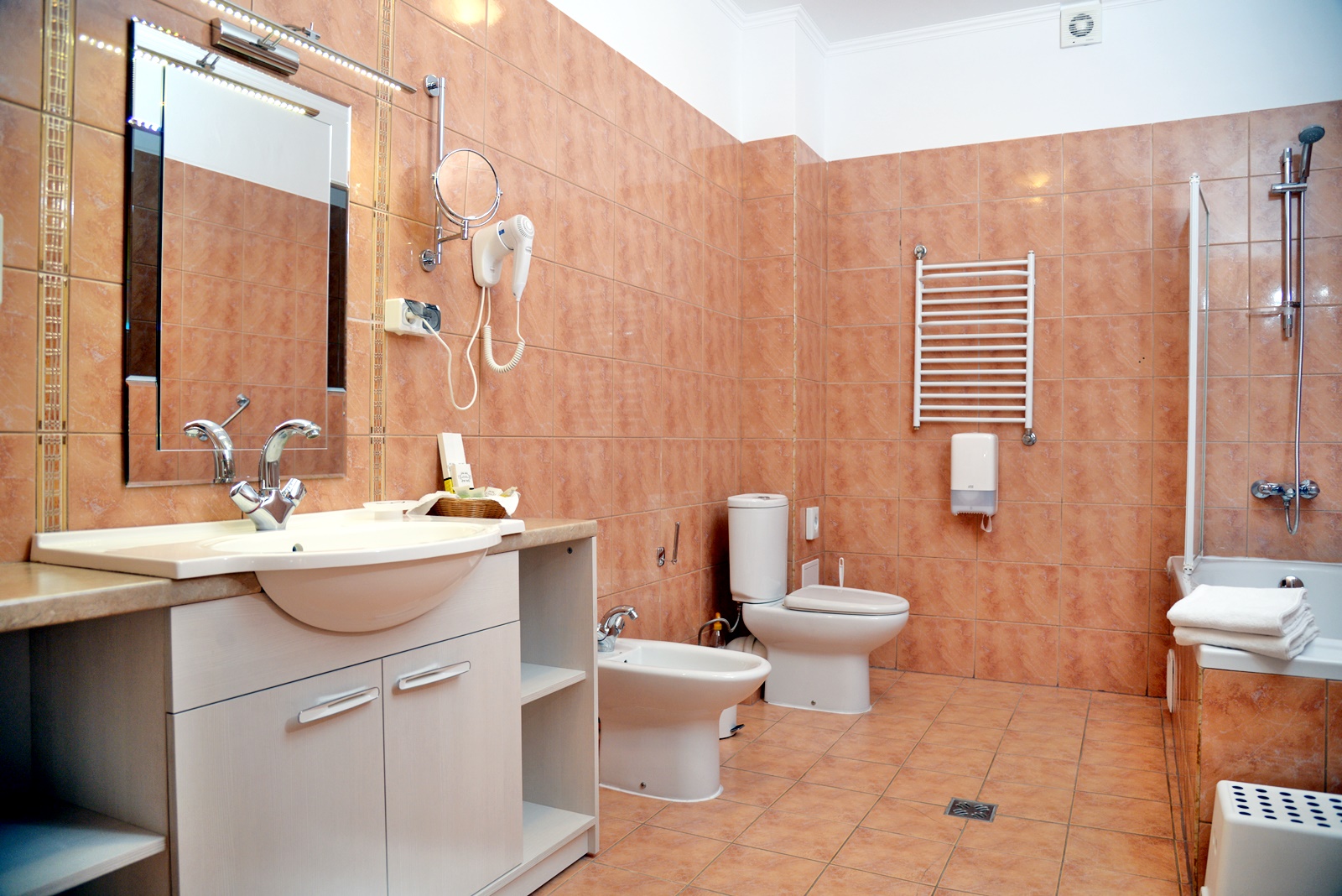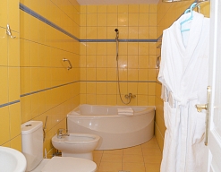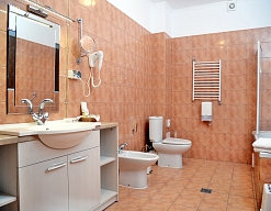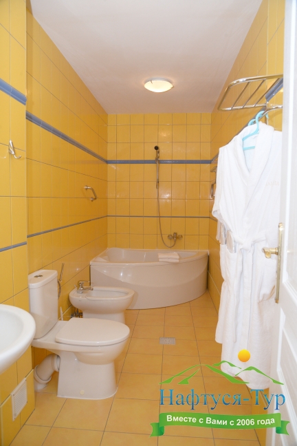 биде, с ванной, тапочки, туалетные принадлежности, фен, халат