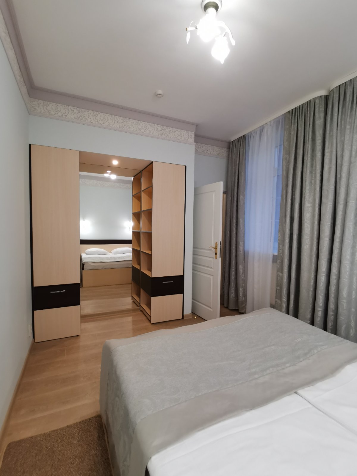 вешалка, зеркало, кровать двуспальная, прикроватные тумбочки, стол, стулья, шкаф