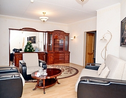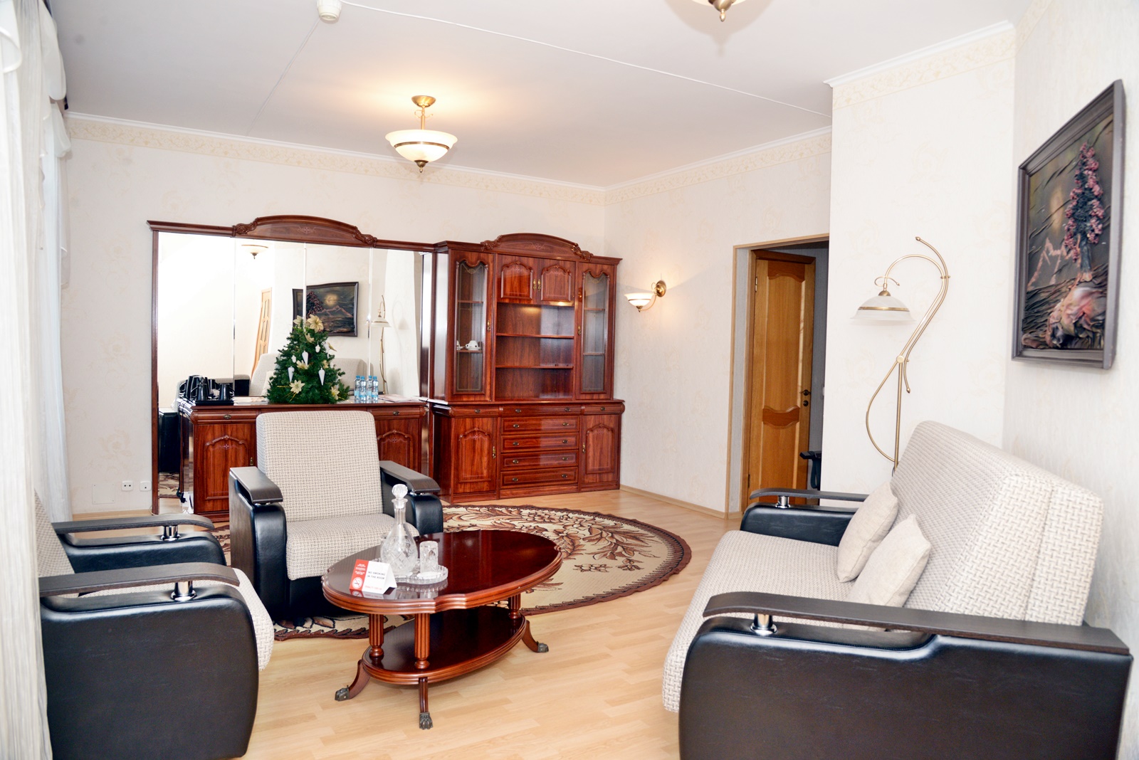 вешалка, диван, зеркало, кровать двуспальная, прикроватные тумбочки, стол, стулья, шкаф