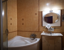 с ванной, тапочки, туалетные принадлежности, фен, халат