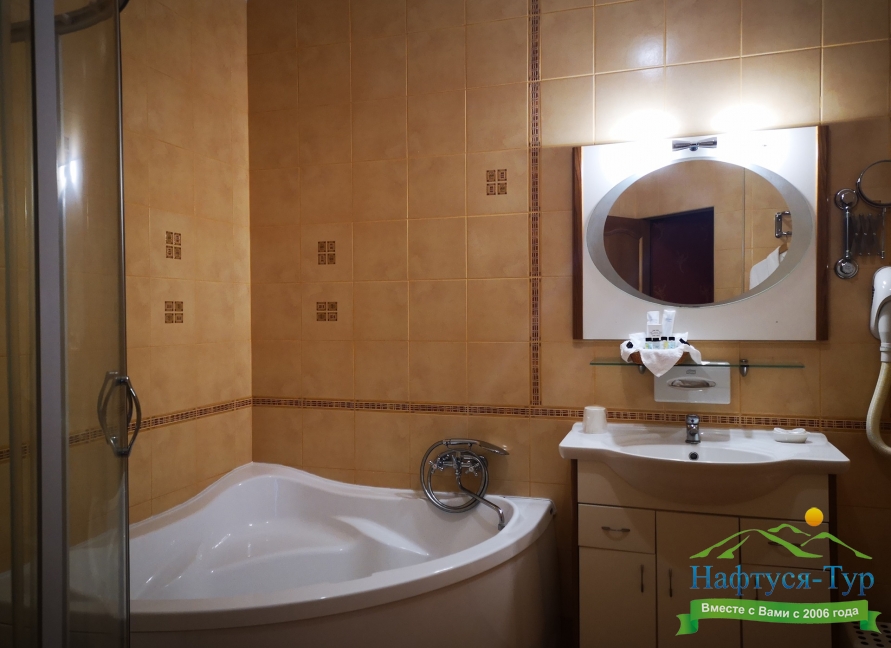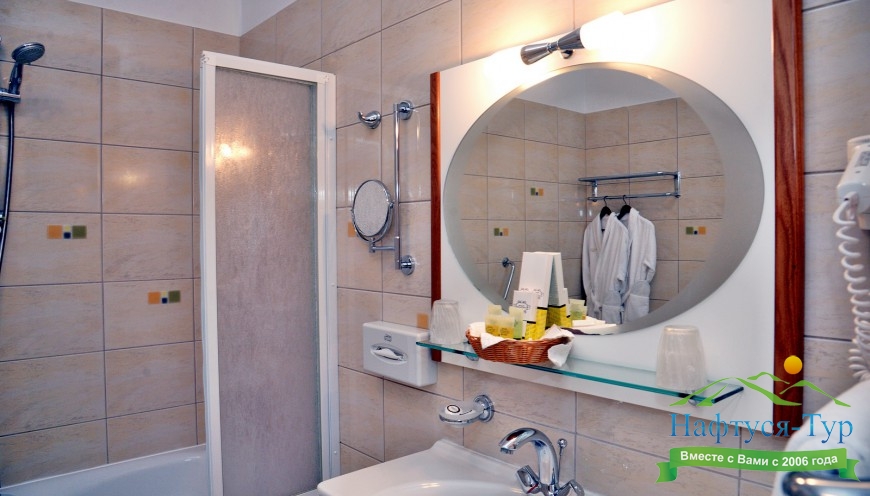с душем, тапочки, туалетные принадлежности, фен, халат