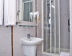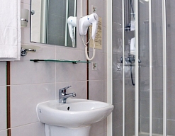 с душевой кабиной, туалетные принадлежности, фен