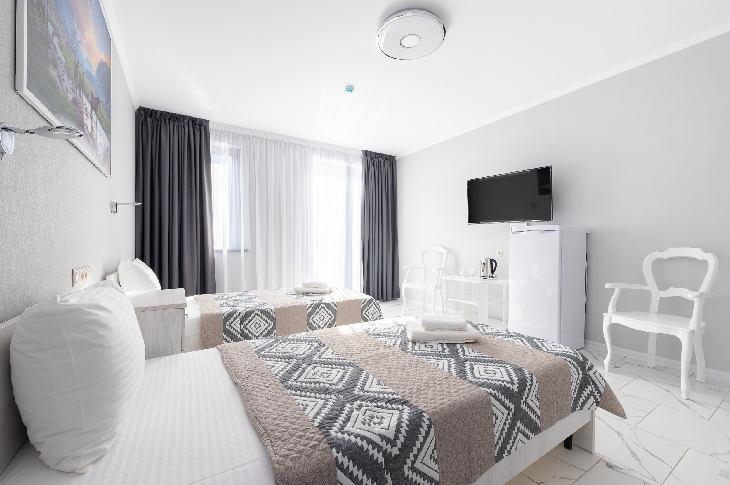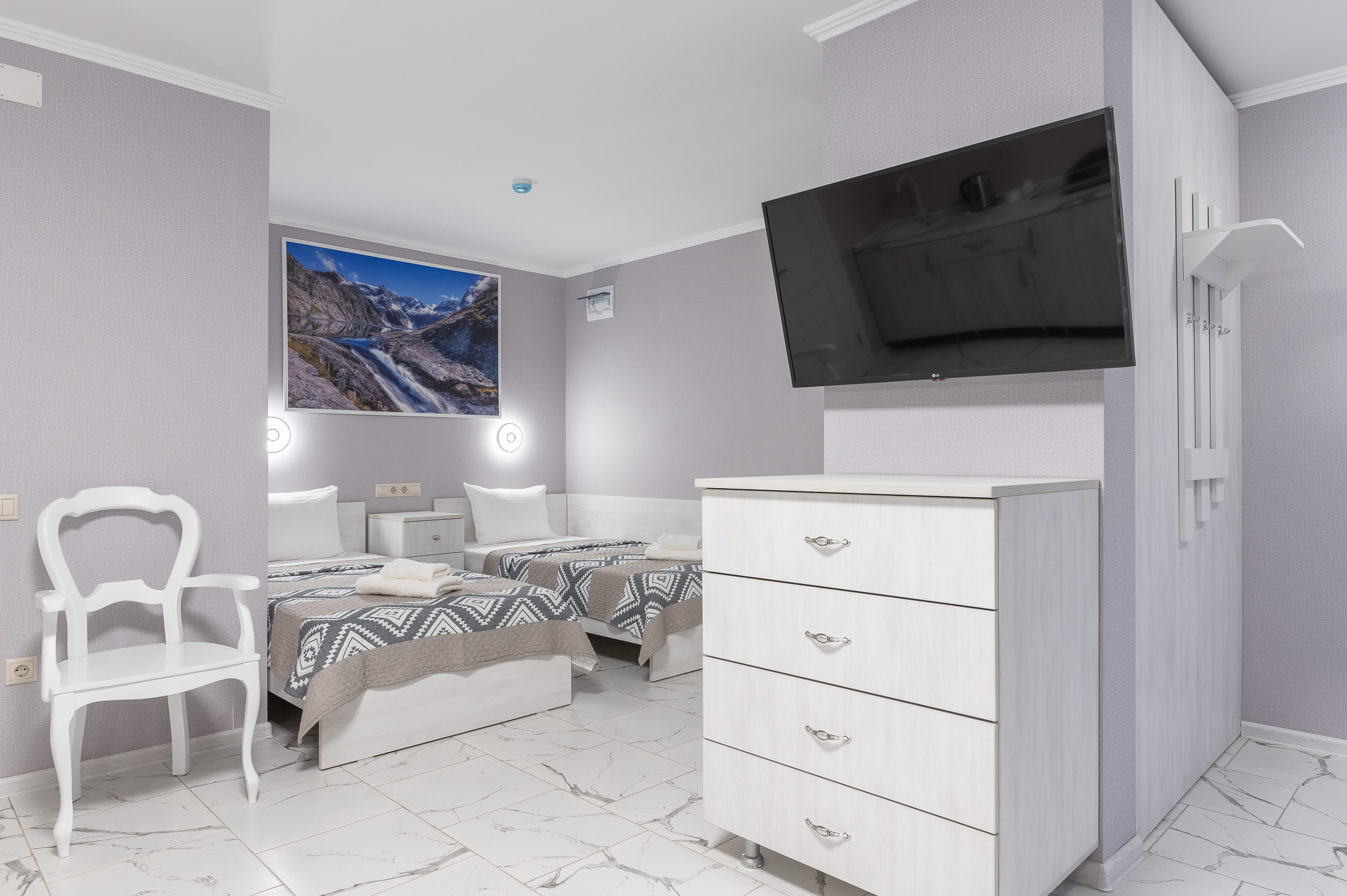 вешалка, зеркало, кровати односпальные /одна двуспальная кровать, прикроватные тумбочки, стол, стулья, шкаф-купе